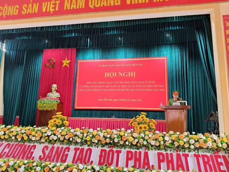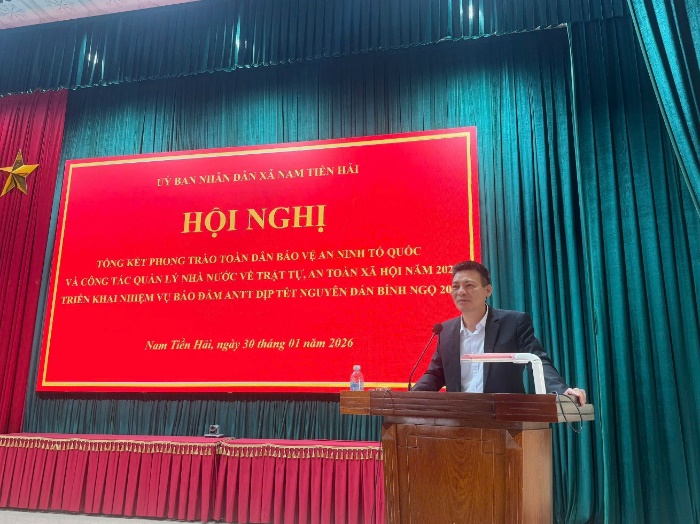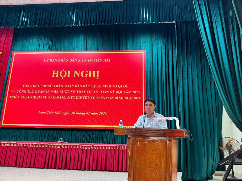 Phát biểu chỉ đạo và kết luận Hội nghị, đồng chí Chủ tịch UBND xã Nam Tiền Hải ghi nhận, biểu dương những kết quả, thành tích mà lực lượng Công an xã đã đạt được trong năm 2025. Đồng chí nhấn mạnh vai trò nòng cốt của lực lượng Công an trong công tác giữ gìn an ninh trật tự, đồng thời yêu cầu tiếp tục nâng cao tinh thần cảnh giác, chủ động phòng ngừa, đấu tranh làm giảm tội phạm và tệ nạn xã hội; đẩy mạnh ứng dụng chuyển đổi số, cải cách hành chính nhằm phục vụ Nhân dân ngày càng tốt hơn. Đồng thời yêu cầu các ban, ngành, đoàn thể và nhân dân tiếp tục phát huy tinh thần trách nhiệm, nâng cao hiệu quả phối hợp trong công tác bảo đảm ANTT; tập trung triển khai đồng bộ các giải pháp đã đề ra, đặc biệt là trong dịp Tết Nguyên đán Bính Ngọ 2026, góp phần giữ vững ổn định chính trị, trật tự an toàn xã hội, phục vụ phát triển kinh tế – xã hội của địa phương.