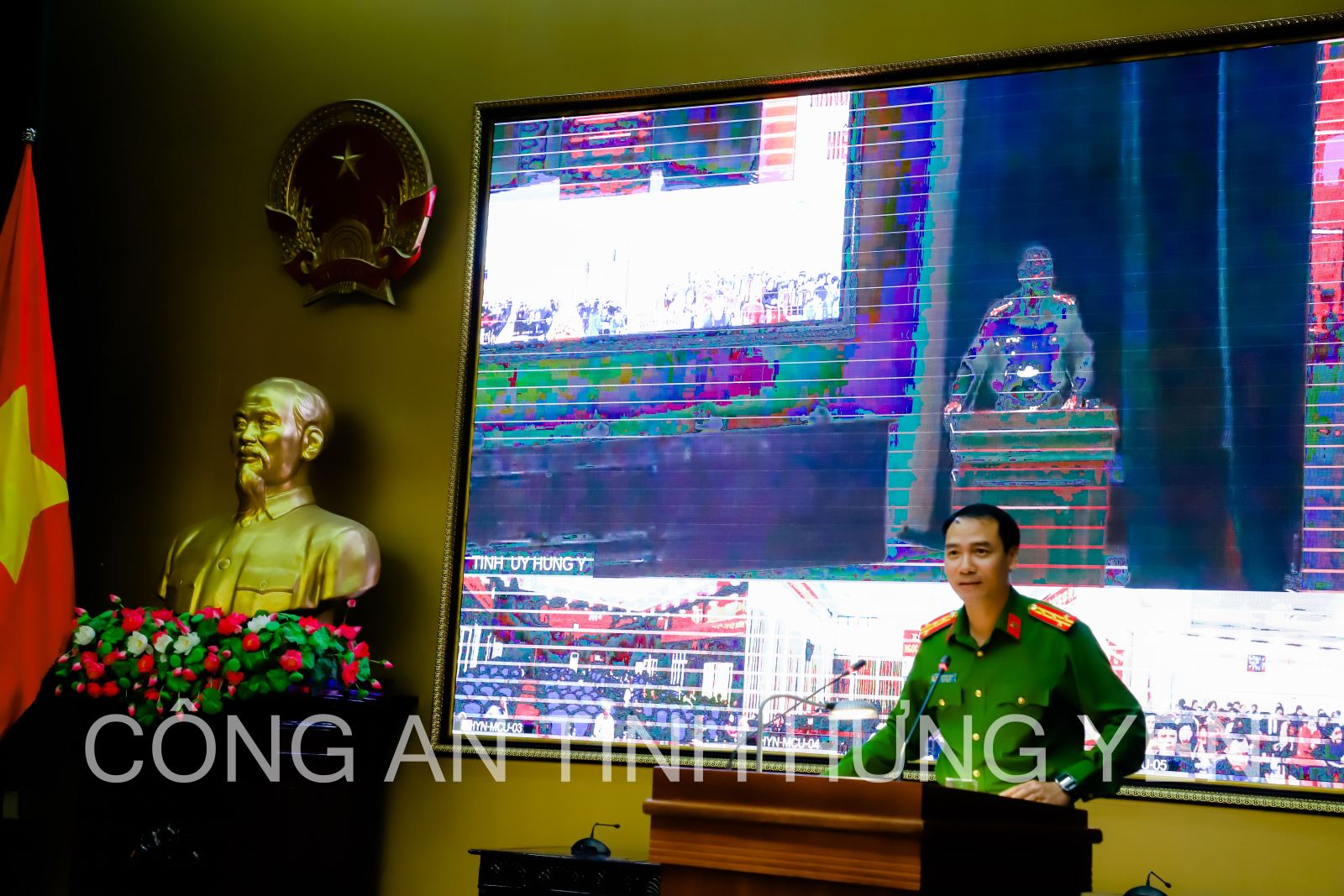 Đồng chí Đại tá Vũ Trung Thành, Phó Giám đốc Công an tỉnh phát biểu tại điểm cầu Tỉnh ủy