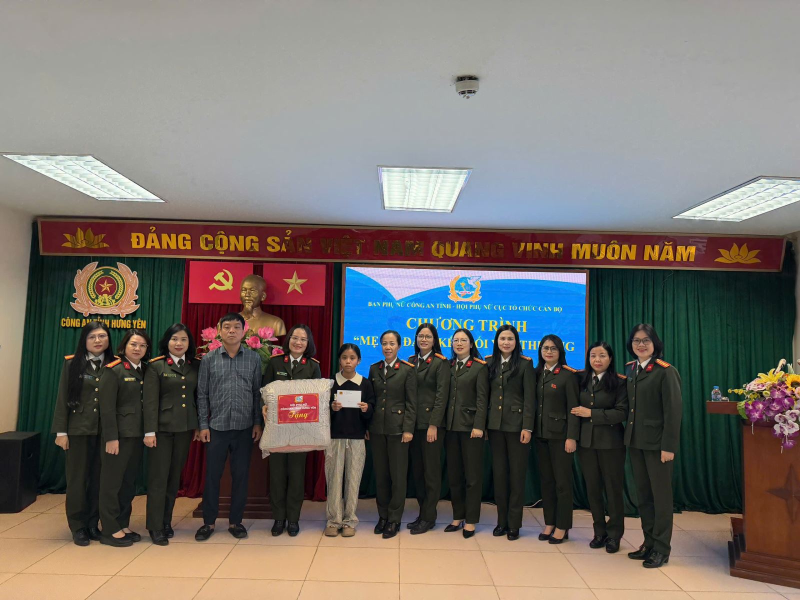 Tại Trụ sở Công an tỉnh Hưng Yên, Hội Phụ nữ Cục Tổ chức cán bộ đã nhận đỡ đầu và trao kinh phí hỗ trợ cho cháu Phạm Thị Thanh Nhàn (sinh năm 2013), trú tại xã Lương Bằng, tỉnh Hưng Yên. Nhân dịp này, Hội Phụ nữ Công an tỉnh Hưng Yên cũng trao tặng phần quà động viên cháu Nhàn, đồng thời gửi gắm tình cảm, mong muốn cháu tiếp tục nỗ lực vượt khó, chăm ngoan, học tốt để vươn lên trong cuộc sống.