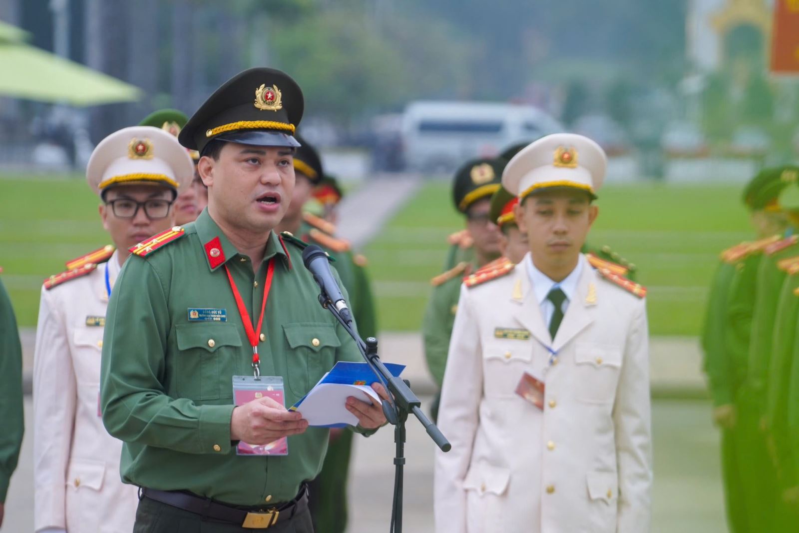 Thượng tá Đồng Đức Vũ - Ủy viên Ban Thường vụ T.Ư Đoàn, Trưởng ban Thanh niên CAND đại diện cho tuổi trẻ lực lượng báo công với Bác