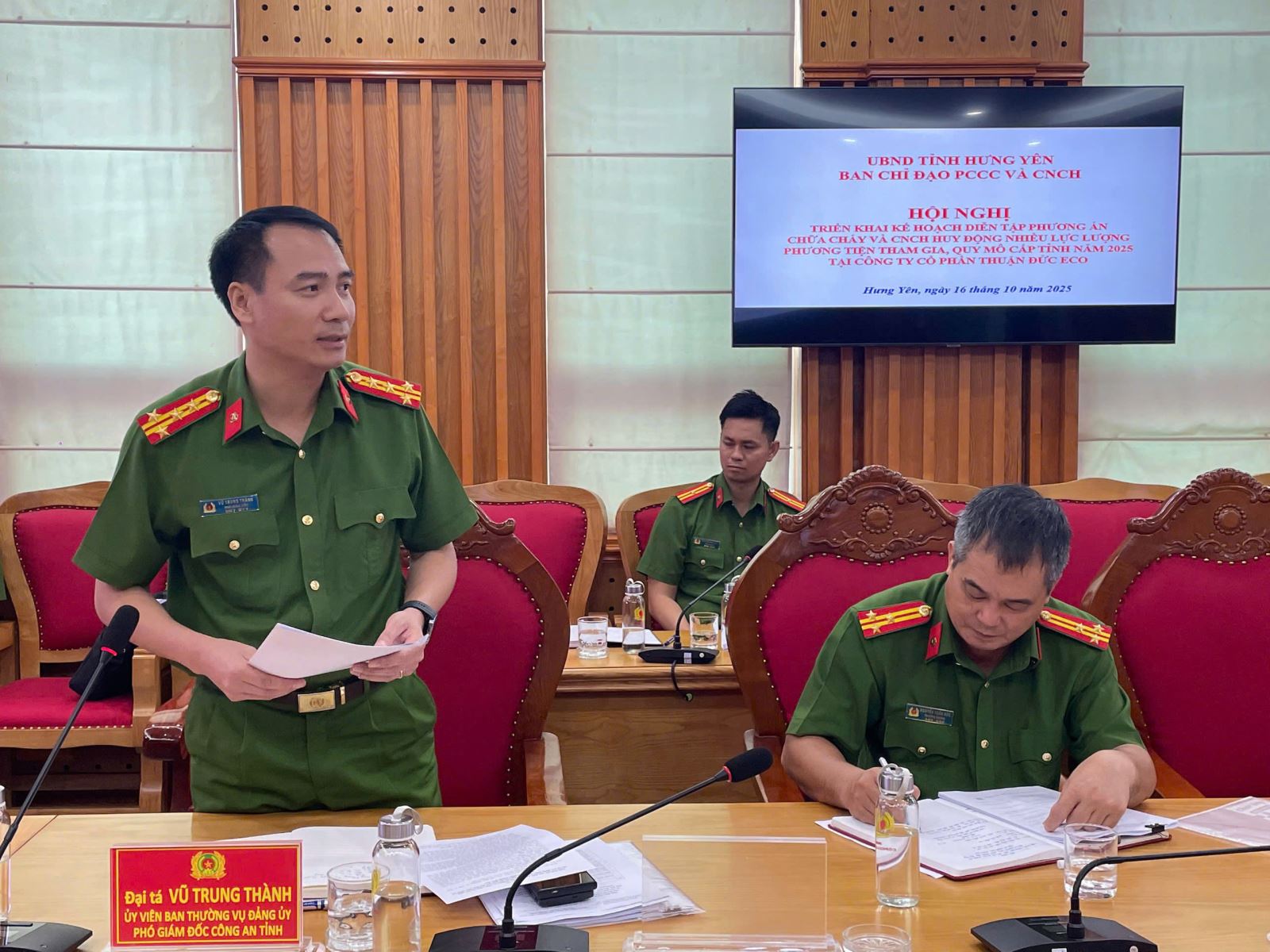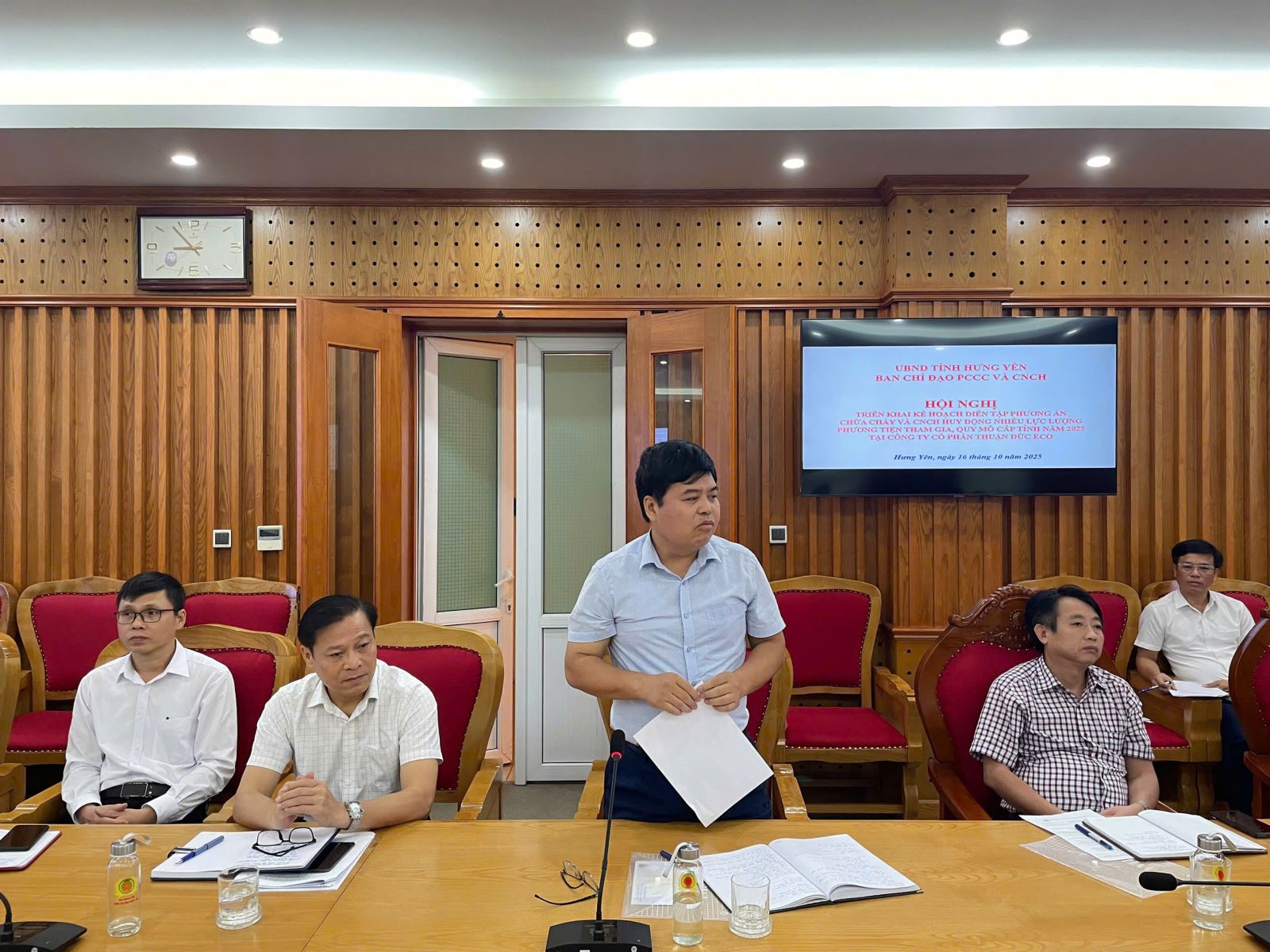 Ngày 16/10/2025, Ban Chỉ đạo diễn tập phương án chữa cháy, cứu nạn, cứu hộ huy động nhiều lực lượng, phương tiện, quy mô cấp tỉnh năm 2025 đã tổ chức họp để thống nhất nội dung, kịch bản và công tác chuẩn bị cho buổi diễn tập tại Công ty Cổ phần Thuận Đức Eco (địa chỉ: xã Lương Bằng, tỉnh Hưng Yên). Đồng chí Nguyễn Lê Huy – Ủy viên Ban Thường vụ Tỉnh ủy, Phó Chủ tịch Ủy ban nhân dân tỉnh, Trưởng Ban Chỉ đạo chủ trì cuộc họp.