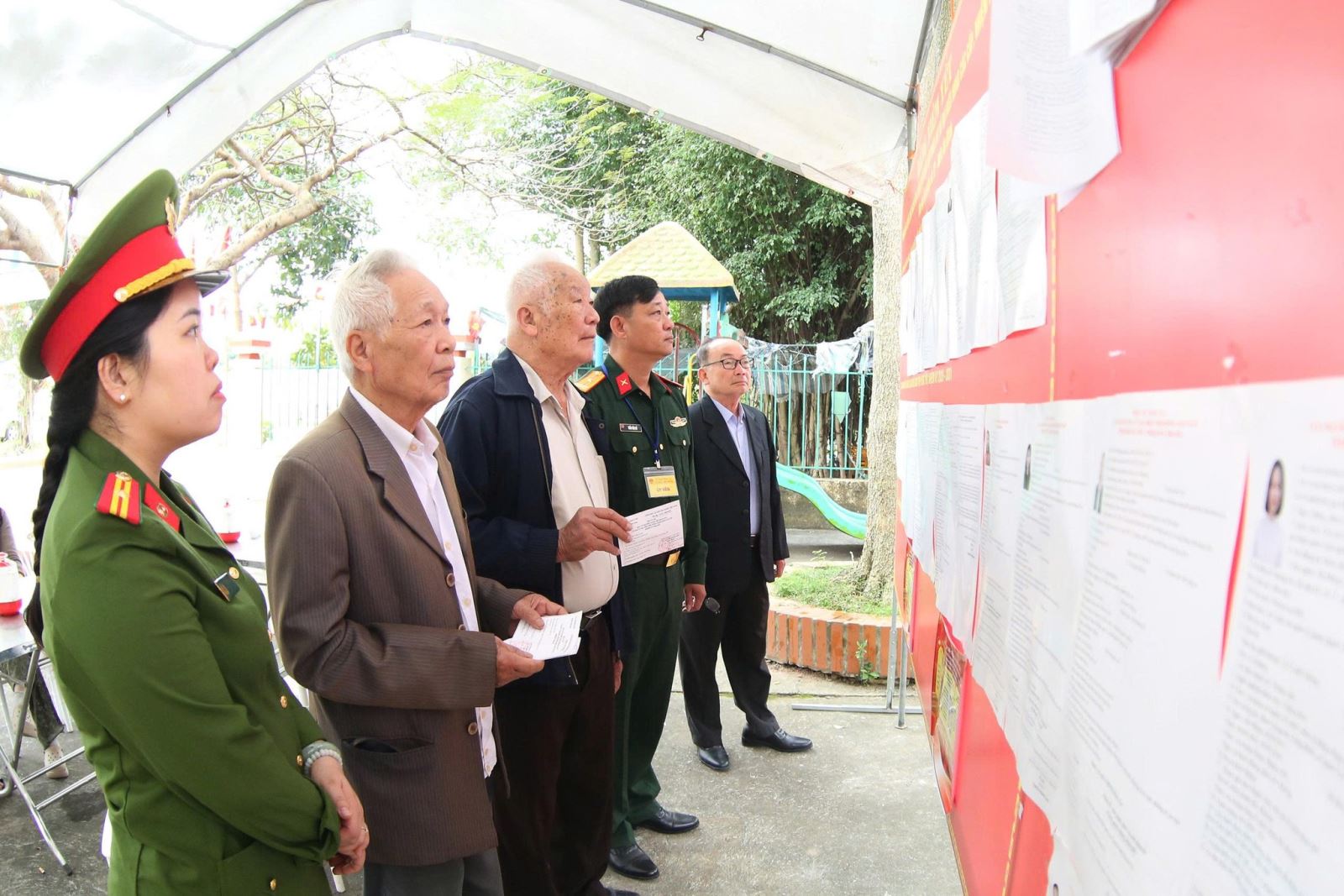 Công an xã hỗ trợ các cử tri cao tuổi di chuyển tới khu vực bầu cử hướng dẫn cho các cử tri bỏ phiếu