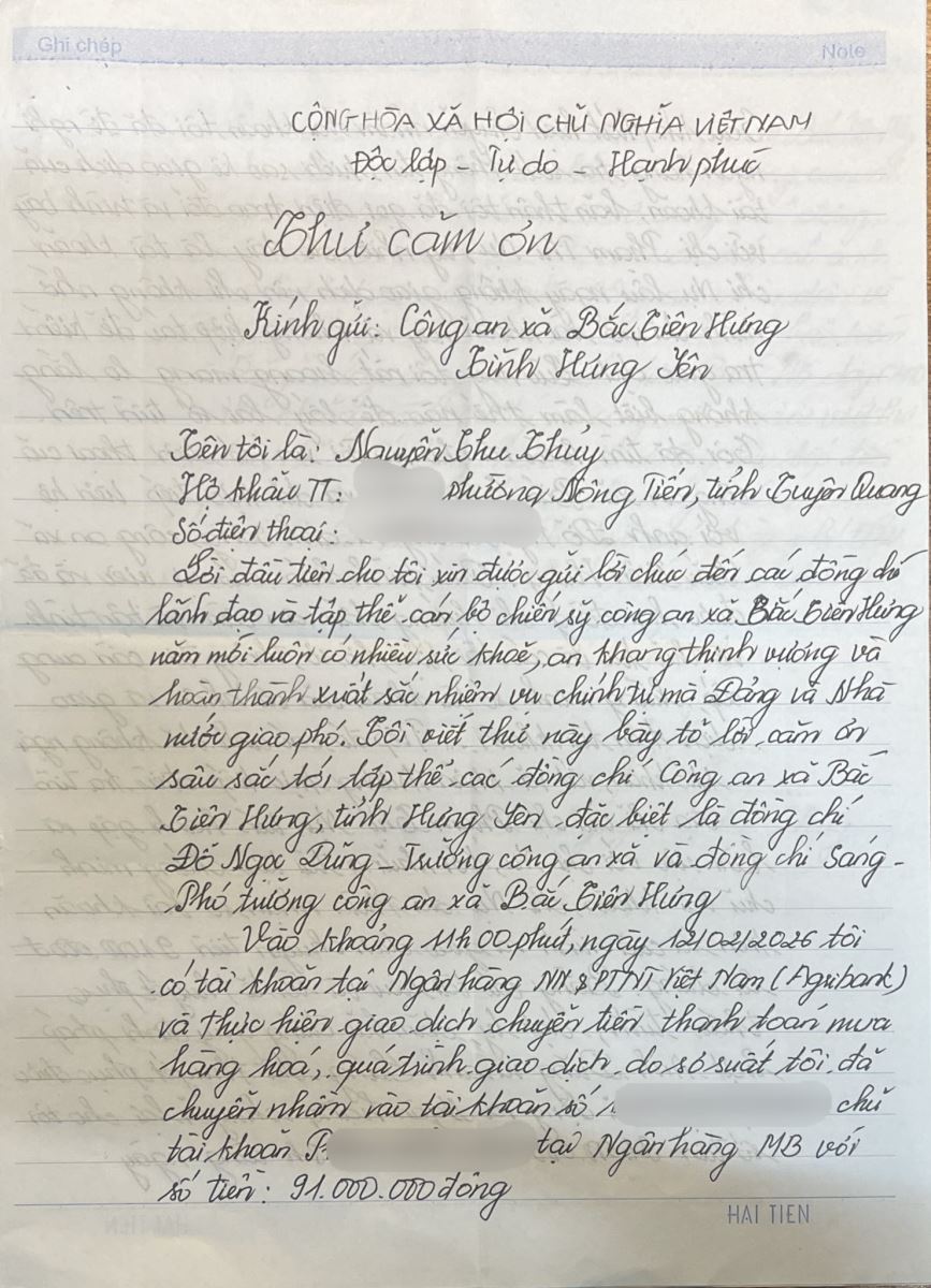 Hình ảnh lá thư cảm ơn của công dân gửi tới Công an xã vì đã tận tình hỗ trợ lấy lại số tiền 91 triệu đồng chuyển khoản nhầm