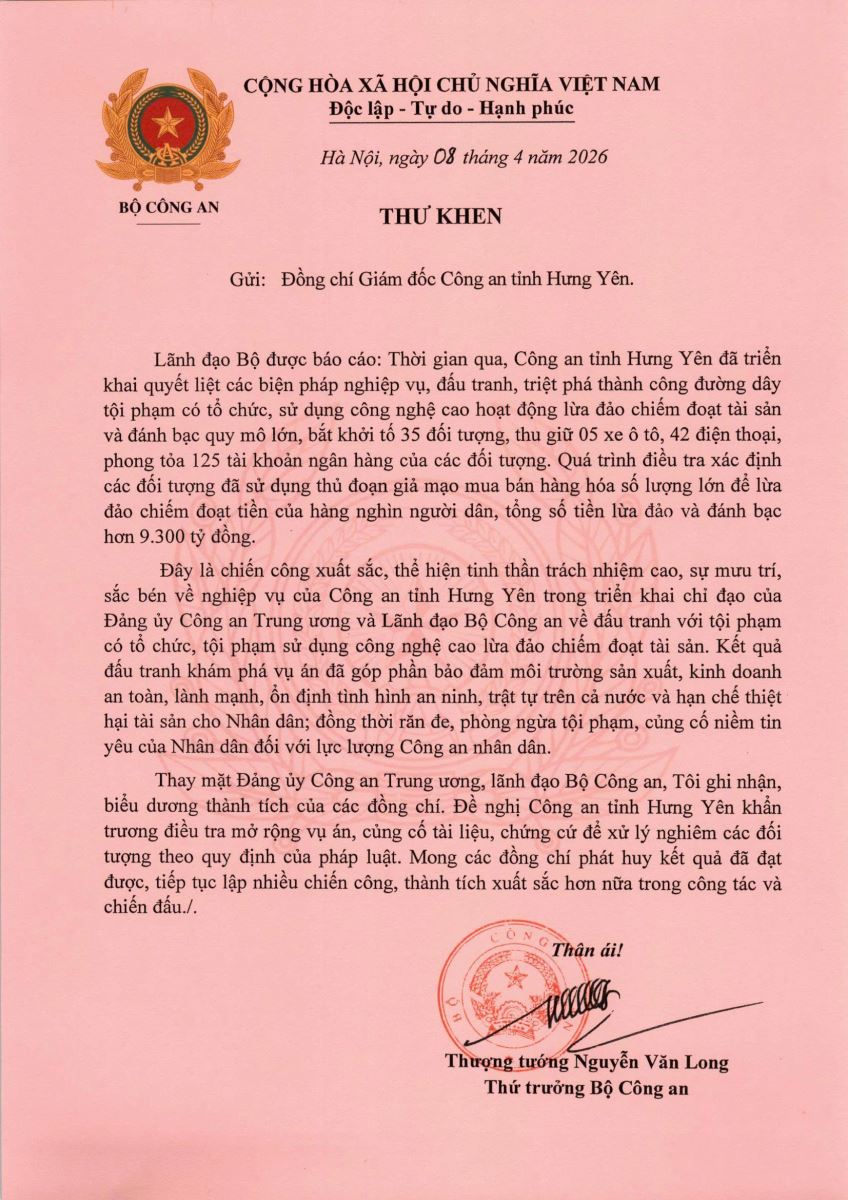 Ngày 08/4/2026, đồng chí Thượng tướng Nguyễn Văn Long, Ủy viên Trung ương Đảng, Thứ trưởng Bộ Công an có Thư khen gửi Công an tỉnh Hưng Yên biểu dương thành tích đấu tranh, triệt phá thành công đường dây tội phạm có tổ chức, sử dụng công nghệ cao hoạt động lừa đảo chiếm đoạt tài sản và đánh bạc quy mô lớn.