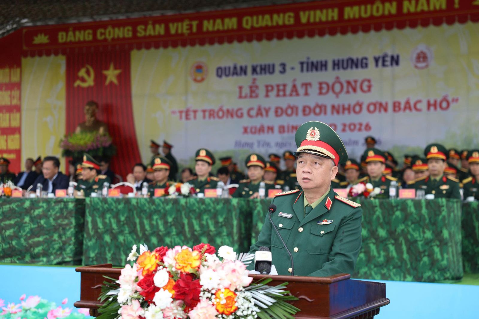 Phát biểu chỉ đạo tại lễ phát động, đồng chí Thượng tướng Nguyễn Quang Ngọc, Ủy viên BCH Trung ương Đảng, Ủy viên Quân ủy Trung ương, Thứ trưởng Bộ Quốc phòng nhấn mạnh: Trong giai đoạn hiện nay, biến đổi khí hậu đang trở thành thách thức mang tính toàn cầu. Việc trồng cây, gây rừng và bảo vệ môi trường sinh thái trở thành một “mệnh lệnh không lời” đối với mỗi cơ quan, tổ chức, đơn vị. Kết quả của phong trào trồng cây không chỉ góp phần tạo sinh kế, cải thiện đời sống người dân, xây dựng cảnh quan “nông thôn mới”, “đô thị văn minh”, mà còn đặc biệt quan trọng trong việc phòng hộ, bảo vệ môi trường và hệ thống kết cấu hạ tầng vùng ven biển; bảo tồn đa dạng sinh học, củng cố quốc phòng và an ninh, xây dựng khu vực phòng thủ tỉnh ngày càng vững chắc. Để phong trào trồng cây năm 2026 nói riêng và giai đoạn 2026- 2030 đạt hiệu quả thiết thực, đồng chí Thứ trưởng Bộ Quốc phòng Nguyễn Quang Ngọc yêu cầu: Thời gian tới, LLVT Quân khu 3 phối hợp chặt chẽ với các cơ quan, đơn vị đóng quân trên địa bàn Quân khu, chủ động phối hợp với cấp ủy, chính quyền các địa phương thực hiện tốt một số nhiệm vụ như: Trồng cây phải đi đôi với chăm sóc và bảo vệ, bảo đảm cây trồng đạt tỉ lệ sống cao và phát triển tốt. Đa dạng hóa các nguồn lực, các chủng loại cây, ưu tiên các loại cây bản địa, cây có giá trị kinh tế cao, cây lấy gỗ kết hợp với cây ăn quả để vừa bảo vệ, cải thiện môi trường vừa góp phần nâng cao đời sống của Nhân dân và cán bộ, chiến sĩ. Các đơn vị quân đội tăng cường tuyên truyền, nâng cao nhận thức cho cán bộ, chiến sĩ LLVT và Nhân dân về vai trò, ý nghĩa to lớn và giá trị nhân văn của việc trồng cây, trồng rừng, công tác bảo vệ rừng, bảo vệ môi trường sinh thái…