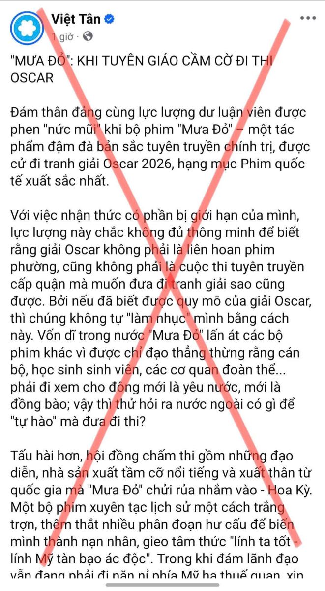 Thế nhưng, thay vì nhìn nhận đúng giá trị, Trang Fanpage Việt Tân lại tìm cách xuyên tạc, gán ghép rằng đây chỉ là một sản phẩm “tuyên truyền chính trị”, thậm chí còn mỉa mai, hạ thấp giá trị của bộ phim. Đây rõ ràng là thủ đoạn quen thuộc, bất kỳ thành tựu nào gắn liền với tinh thần dân tộc và niềm tự hào Việt Nam cũng đều bị chúng tìm cách bóp méo, chống phá.