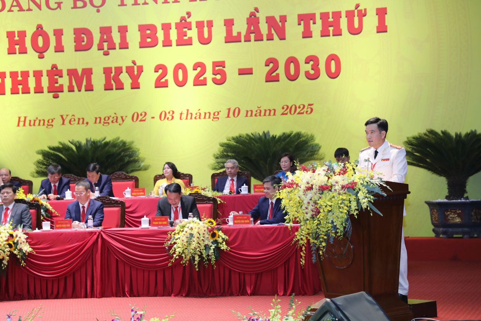 Đồng chí Đại tá Nguyễn Thành Sơn - Phó Bí thư Đảng ủy, Phó Giám đốc Công an tỉnh phát biểu tham luận tại Đại hội Đại biểu Đảng bộ tỉnh Hưng Yên lần thứ I, nhiệm kỳ 2025-2030