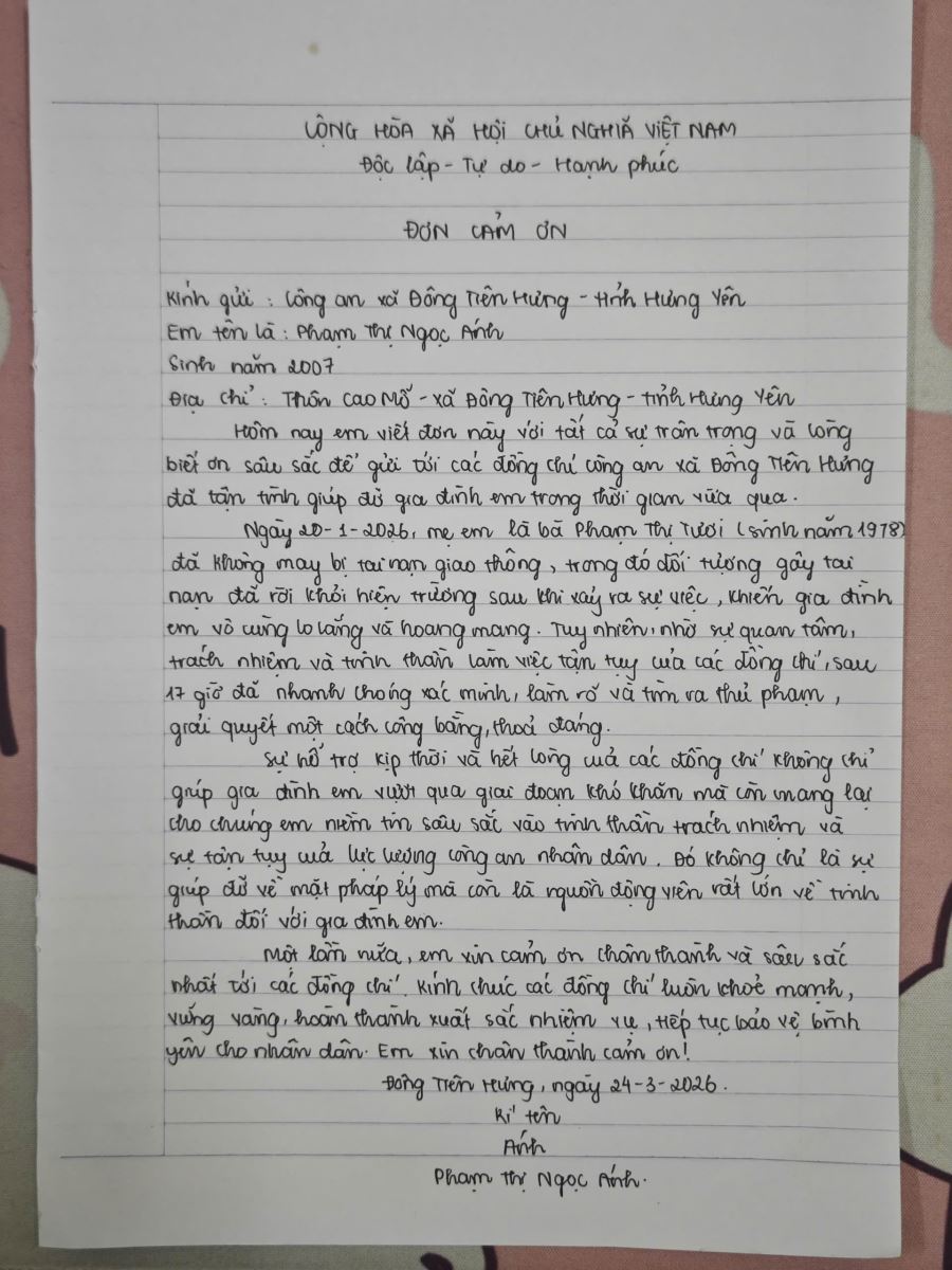 Mới đây, Công an xã Đông Tiên Hưng (tỉnh Hưng Yên) đã nhận được thư cảm ơn của em Phạm Thị Ngọc Ánh, trú tại thôn Cao Mỗ, xã Đông Tiên Hưng, bày tỏ sự trân trọng và biết ơn sâu sắc đối với tinh thần trách nhiệm, tận tụy vì Nhân dân phục vụ của lực lượng Công an xã.