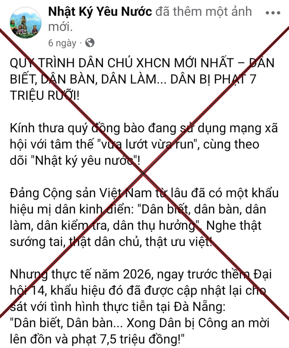 Trong thời gian gần đây, trên không gian mạng xuất hiện bài viết xuyên tạc khẩu hiệu “Dân biết, dân bàn, dân làm, dân kiểm tra, dân thụ hưởng”, cố tình cắt ghép, bẻ cong thành luận điệu cho rằng “dân biết, dân bàn… xong dân bị công an mời lên đồn và phạt 7,5 triệu đồng”. Đây là luận điệu phủ nhận bản chất nền dân chủ xã hội chủ nghĩa ở Việt Nam, gây hoang mang dư luận và làm suy giảm niềm tin của Nhân dân đối với Đảng, Nhà nước và lực lượng thực thi pháp luật.
