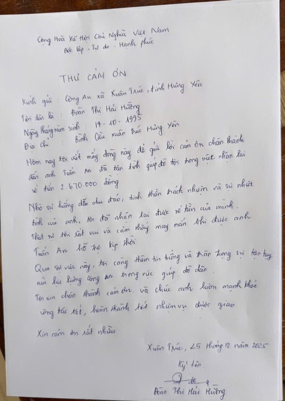 Bất ngờ, xúc động khi nhận lại tài sản của mình, đồng thời cảm kích trước tinh thần “Vì Nhân dân phục vụ” của lực lượng Công an xã Xuân Trúc, chị Hường đã viết thư cảm ơn gửi tới đồng chí Đại úy Nguyễn Tuấn An nói riêng và tập thể Công an xã Xuân Trúc nói chung.