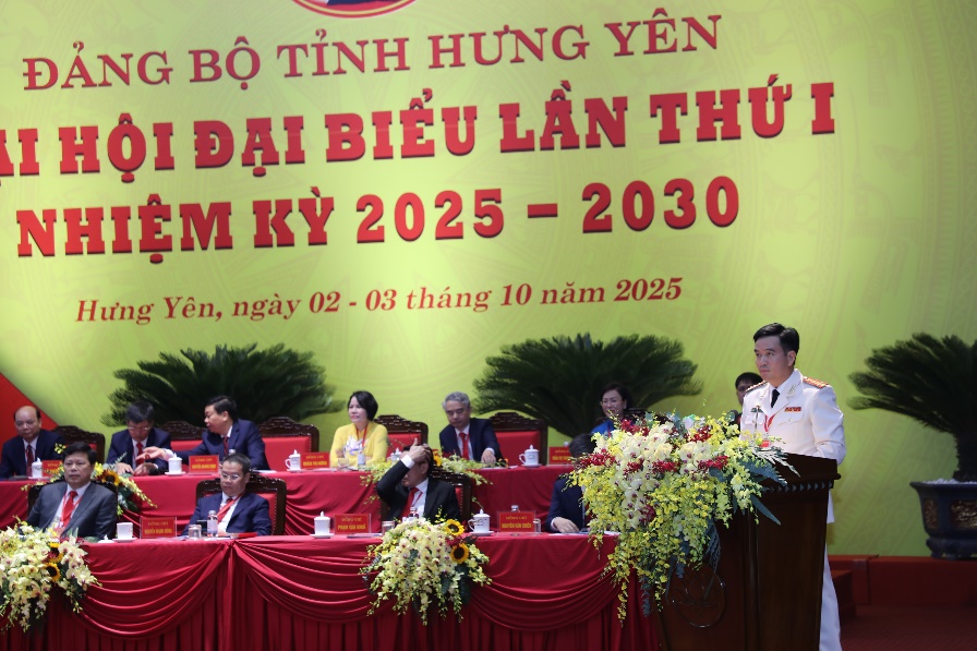 Theo Chương trình làm việc, chiều ngày 02/10/2025, Đại hội đại biểu Đảng bộ tỉnh Hưng Yên lần thứ I , nhiệm kỳ 2025 - 2030 tiếp tục thảo luận góp ý vào dự thảo các Văn kiện trình Đại hội và quán triệt về một số nội dung ngày làm việc thứ hai của Đại hội. Đồng chí Đại tá Nguyễn Thành Sơn – Phó Bí thư Đảng uỷ, Phó Giám đốc Công an tỉnh phát biểu tham luận tại Đại hội.