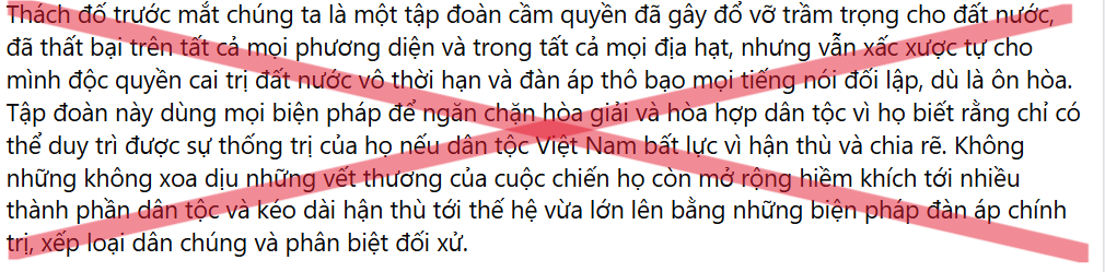 Với thực tiễn đó, những luận điệu xuyên tạc, dối trá của các thế lực thù địch, tổ chức phản động lưu vong đã nói ở trên là những hành động phá hoại khối đại đoàn kết toàn dân tộc; phá hoại sự nghiệp xây dựng và bảo vệ Tổ quốc Việt Nam xã hội chủ nghĩa. Những luận điệu đó cần phải được nhận diện, kiên quyết đấu tranh bác bỏ, để ngày hội non sông được trọn vẹn ý nghĩa, để tinh thần thống nhất, đoàn kết dân tộc luôn đong đầy trong mỗi trái tim con người Việt Nam.