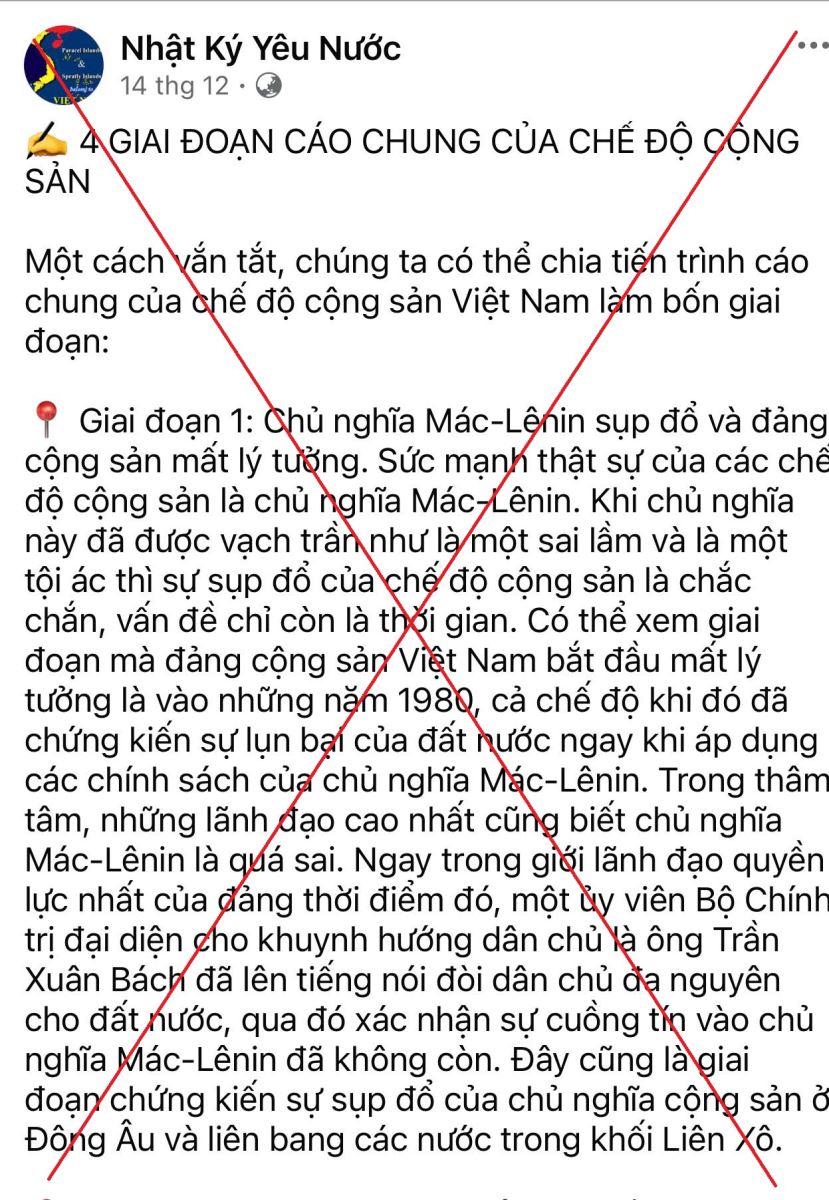 Bài viết mang tiêu đề “4 giai đoạn cáo chung của chế độ cộng sản” là một sản phẩm điển hình của hoạt động chống phá tư tưởng, sử dụng phương pháp gán ghép chủ quan, suy diễn chính trị, cắt xén lịch sử, nhằm gieo rắc hoài nghi, phủ nhận vai trò lãnh đạo của Đảng Cộng sản Việt Nam và con đường đi lên chủ nghĩa xã hội mà nhân dân ta đã lựa chọn. Toàn bộ bài viết không dựa trên bằng chứng khoa học, cơ sở pháp lý hay thực tiễn khách quan, mà chủ yếu dựa vào: Nhận định cảm tính; Suy đoán động cơ cá nhân; Đánh đồng hiện tượng cá biệt với bản chất chế độ; Lặp lại các luận điệu cũ của các tổ chức, cá nhân chống đối ở nước ngoài. Đây là thủ đoạn quen thuộc trong chiến lược “phi chính trị hóa – phủ nhận vai trò lãnh đạo của Đảng – thúc đẩy đa nguyên, đa đảng” mà các thế lực thù địch đang kiên trì theo đuổi.