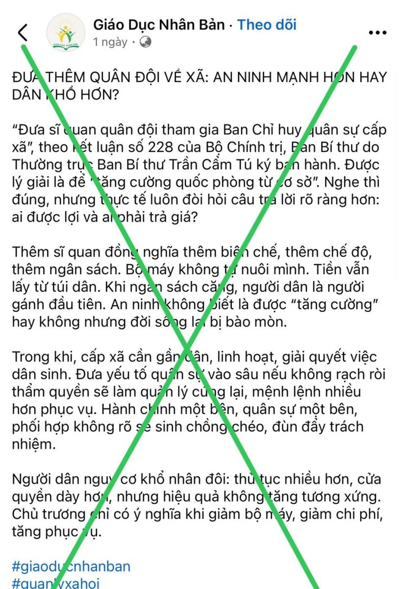 Thời gian gần đây, trên một số trang mạng xã hội xuất hiện những quan điểm sai trái, xuyên tạc, cho rằng việc bố trí sĩ quan, quân nhân chuyên nghiệp về công tác tại Ban chỉ huy quân sự cấp xã là “làm phình to bộ máy”, “tăng gánh nặng ngân sách”, “quân sự hóa chính quyền cơ sở”, thậm chí quy chụp rằng người dân sẽ “khổ hơn” và đời sống bị ảnh hưởng tiêu cực. Đây là những luận điệu phiến diện, thiếu căn cứ thực tiễn, mang động cơ kích động, gây hoài nghi trong nhân dân đối với chủ trương đúng đắn của Đảng và Nhà nước.