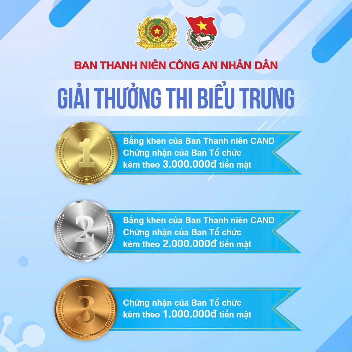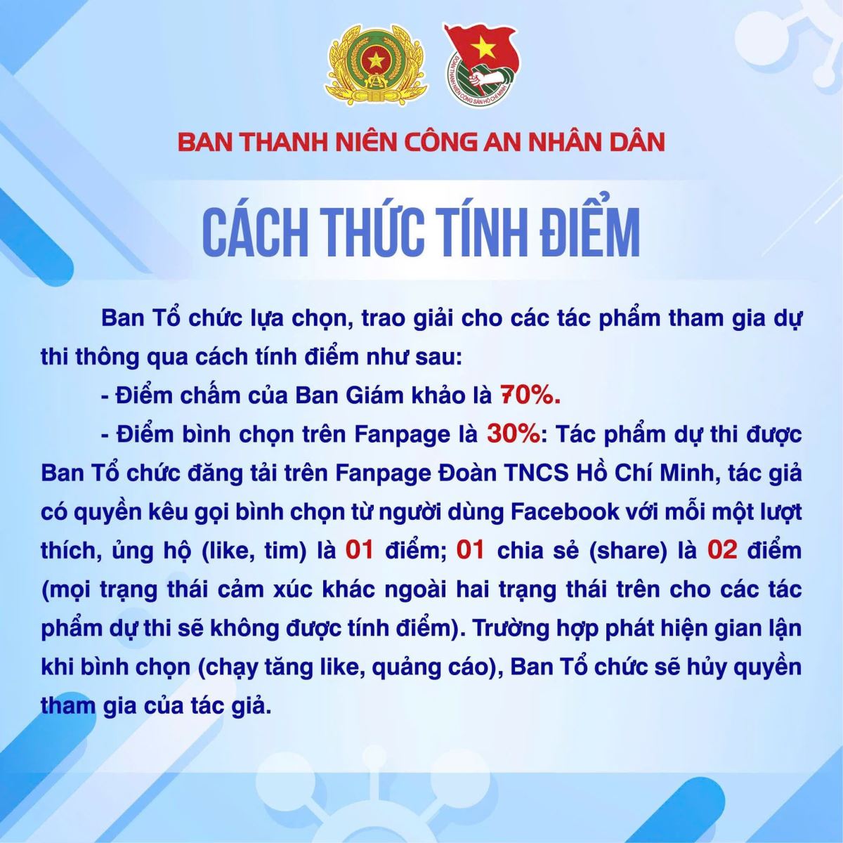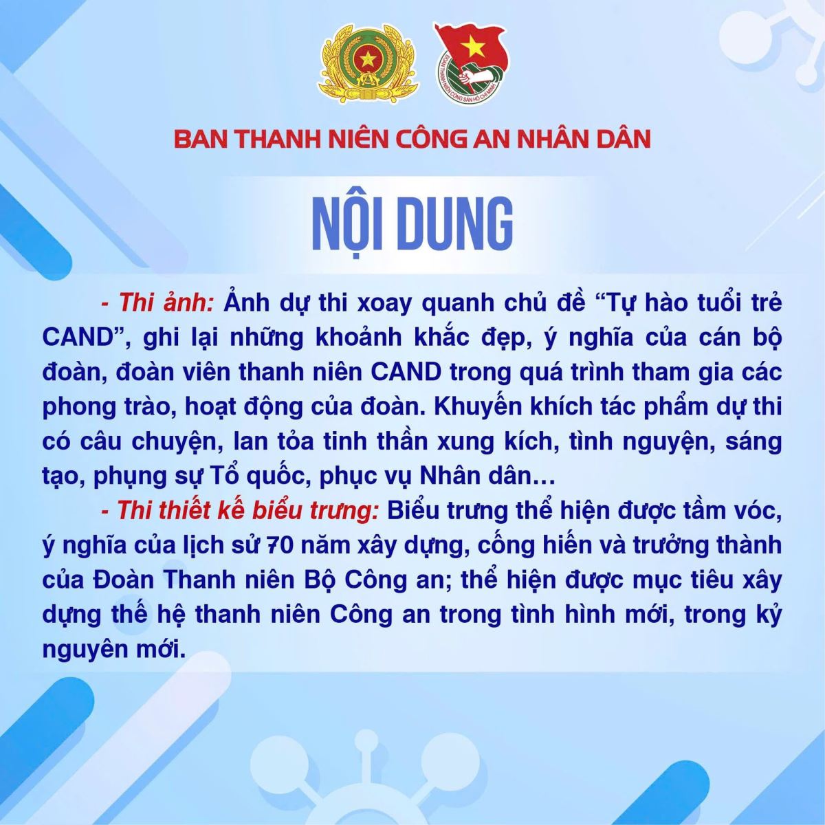 Các tác phẩm dự thi của đoàn viên, thanh niên Công an tỉnh được gửi về Ban Thanh niên Công an tỉnh để tổ chức chấm sơ khảo, lựa chọn những tác phẩm tiêu biểu, chất lượng gửi tham gia vòng thi cấp Bộ theo quy định. Đối với thi ảnh, tác phẩm dự thi là file hình ảnh gốc; đối với thi thiết kế biểu trưng, tác phẩm dự thi gồm file sản phẩm thiết kế kèm thuyết minh mô tả ý tưởng thiết kế.