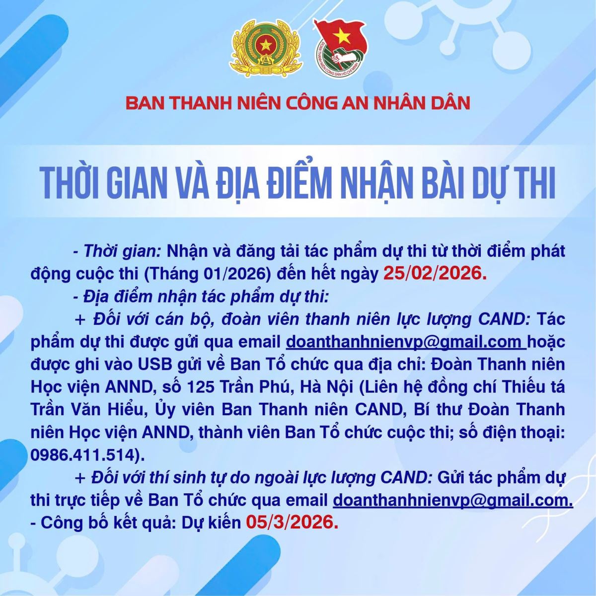 Thời gian nhận tác phẩm dự thi đến hết ngày 22/02/2026 qua địa chỉ email: doanthanhniencahy@gmail.com. Thông tin chi tiết về nội dung, thể lệ và yêu cầu của Cuộc thi được thể hiện tại Infographics dưới đây: