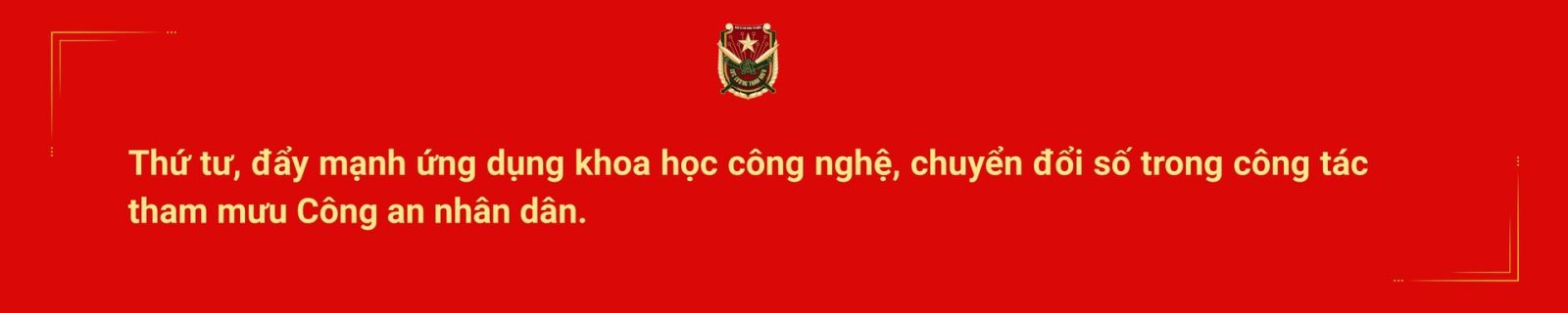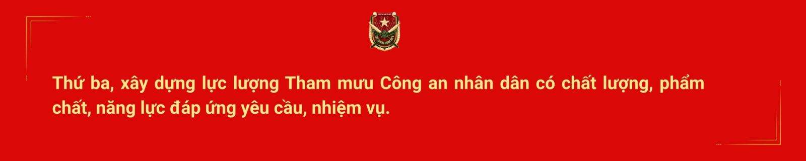 Tập trung xây dựng đội ngũ cán bộ làm công tác tham mưu có kiến thức cần thiết trên các lĩnh vực; nắm vững các đường lối, chủ trương, chính sách của Đảng và pháp luật của Nhà nước; có bản lĩnh chính trị vững vàng, trung thực, nhạy bén, chủ động, sáng tạo, khách quan, toàn diện, sâu sắc, cụ thể; có tinh thần, trách nhiệm cao, tận tụy, tâm huyết với nghề nghiệp; có trình độ, kỹ năng biên tập văn bản, là những cán bộ Công an "Kỷ luật nhất - Trung thành nhất - Gần dân nhất".