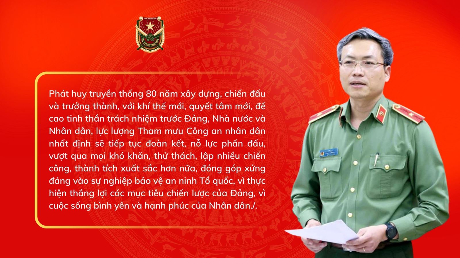 Phát huy truyền thống 80 năm xây dựng, chiến đấu và trưởng thành, với khí thế mới, quyết tâm mới, đề cao tinh thần trách nhiệm trước Đảng, Nhà nước và Nhân dân, lực lượng Tham mưu Công an nhân dân nhất định sẽ tiếp tục đoàn kết, nỗ lực phấn đấu, vượt qua mọi khó khăn, thử thách, lập nhiều chiến công, thành tích xuất sắc hơn nữa, đóng góp xứng đáng vào sự nghiệp bảo vệ an ninh Tổ quốc, vì thực hiện thắng lợi các mục tiêu chiến lược của Đảng, vì cuộc sống bình yên và hạnh phúc của Nhân dân./.