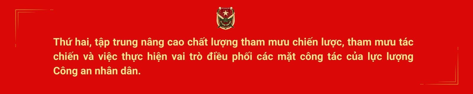 Trong công tác tham mưu chiến lược, cần tập trung cao độ trí tuệ, huy động sự tham gia có hiệu quả của các lực lượng trong Công an nhân dân, các chuyên gia, cán bộ Công an lão thành, tham mưu Đảng ủy Công an Trung ương phối hợp chặt chẽ với các ban, bộ, ngành liên quan xây dựng trình Bộ Chính trị, Ban Chấp hành Trung ương Đảng Nghị quyết về Chiến lược an ninh quốc gia và Nghị quyết về xây dựng xã hội trật tự, kỷ cương, an toàn, lành mạnh, văn minh, phát triển, cụ thể hóa đầy đủ tư duy, nhận thức mới của Đảng ta, hình thành các chiến lược tổng thể về các vấn đề đặc biệt hệ trọng của đất nước, tạo nguồn lực, động lực mới góp phần thực hiện thắng lợi các mục tiêu "hoà bình, ổn định; phát triển bền vững, chất lượng cao; nâng cao mọi mặt đời sống của Nhân dân", hiện thực hóa mục tiêu đến năm 2045, Việt Nam trở thành nước phát triển, thu nhập cao, là một nước xã hội chủ nghĩa hòa bình, độc lập, dân chủ, giàu mạnh, phồn vinh, văn minh, hạnh phúc.