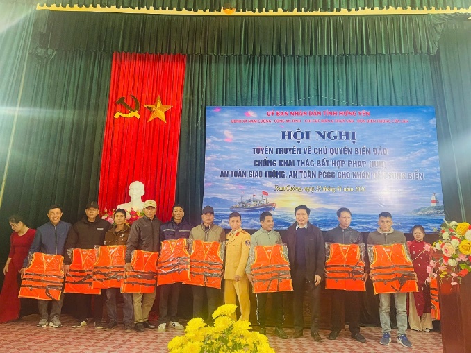 Nhằm động viên kịp thời, chia sẻ những khó khăn cùng bà con ngư dân, tạo động lực để ngư dân yên tâm vươn khơi, bám biển, phát triển kinh tế gắn với chủ quyền biển đảo của Tổ quốc. Đại diện lãnh đạo Phòng Cảnh sát giao thông, Phòng Cảnh sát PCCC và CNCH – Công an tỉnh Hưng Yên, Chi cục Biển và Thuỷ sản, Đồn Biên phòng Cửa Lân đã trao tặng những phần quà là tiền mặt, cờ Tổ quốc, áo phao, bình chữa cháy cho các Tổ tàu thuyền tự quản và các chủ phương tiện.