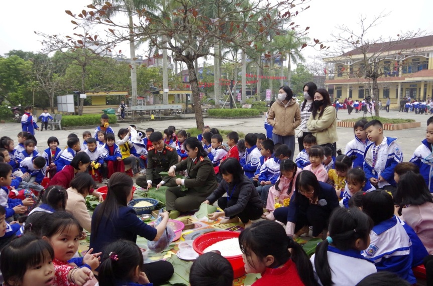 Cán bộ, chiến sĩ tham gia trải nghiệm gói bánh chưng cùng các em học sinh