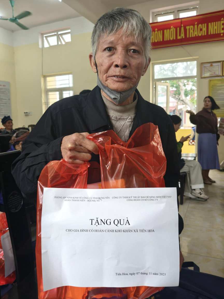 Tại chương trình, Đại diện Phòng An ninh kinh tế Công an tỉnh và Công ty Ming Shin đã trao 33 suất quà, trong đó 30 suất tặng các hộ nghèo, hộ có hoàn cảnh đặc biệt khó khăn của xã Tiên Hòa và 03 suất tặng cho công nhân, nhân viên Công ty Ming Shin có hoàn cảnh gia đình khó khăn. Trên khuôn mặt của nhiều bà con và người lao động hiện rõ niềm xúc động, phấn khởi khi được quan tâm, hỗ trợ cả về vật chất lẫn tinh thần. Mỗi suất quà tuy giá trị không lớn nhưng là nguồn động viên kịp thời, giúp các gia đình và người lao động thêm ấm lòng trong những ngày mùa đông đang tới.