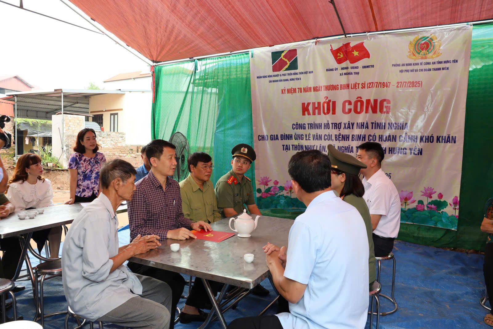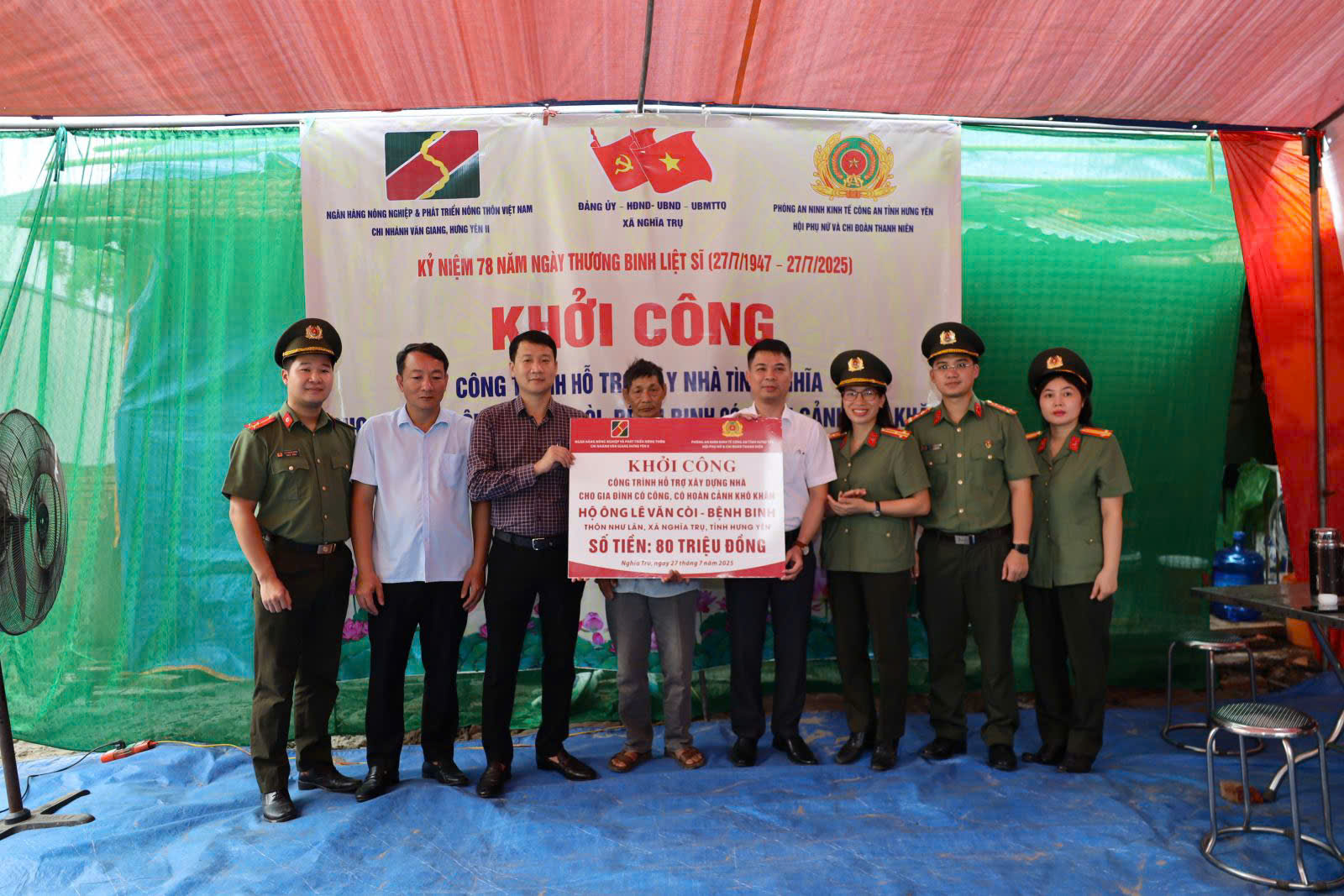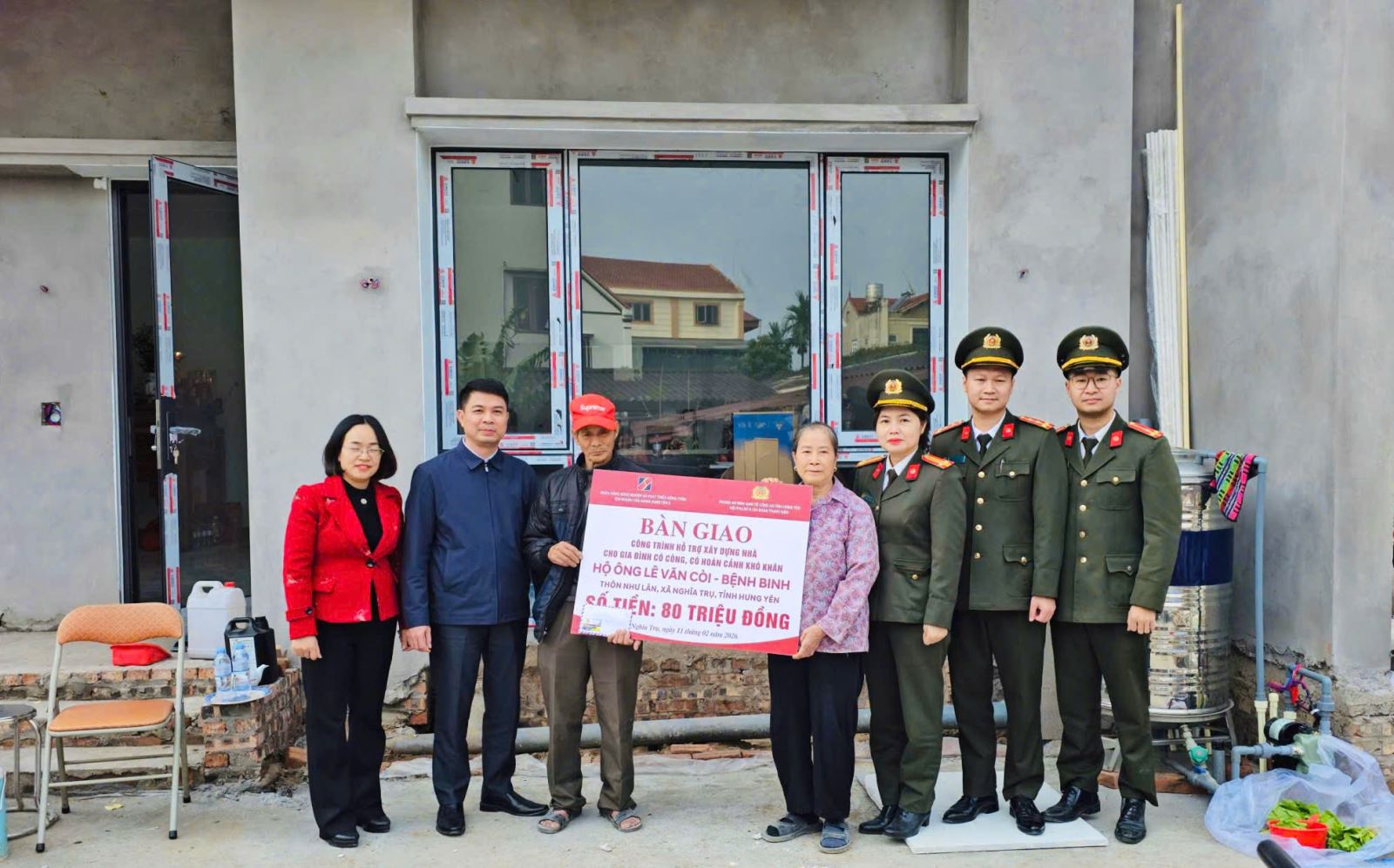 Tiếp tục hưởng ứng phong trào thi đua “Chung ta xóa nhà tạm, nhà dột nát trên phạm vi cả nước” để không ai bị bỏ lại phía sau trong kỷ nguyên vươn mình của dộc do Thủ tướng Chính phủ phát động tại Chỉ thị số 42/CT-TTg ngày 09/11/2024 và thực hiện Kế hoạch số 4122/KH-CAT-PX03 ngày 14/12/2024 của Giám đốc Công an tỉnh về phát động phong trào thi đua “Chung tay xóa nhà tạm, nhà dột nát trên địa bàn tỉnh Hưng Yên”; đồng thời thiết thực tổ chức các hoạt động chào mừng năm mới Xuân Bính Ngọ 2026 và Bầu cử đại biểu Quốc hội khóa XVI và Đại biểu hội đồng nhân dân các cấp nhiệm kỳ 2026 - 2031, Phòng An ninh kinh tế đã phối hợp với Ngân hàng Nông nghiệp & Phát triển nông thôn chi nhánh Văn Giang Hưng Yên II, Đảng ủy - UBND xã Nghĩa Trụ tổ chức Lễ Khánh thành và Bàn giao Công trình hỗ trợ xây dựng nhà cho ông Lê Văn Còi là bệnh binh, người có công có hoàn cảnh khó khăn trên địa bàn xã.
