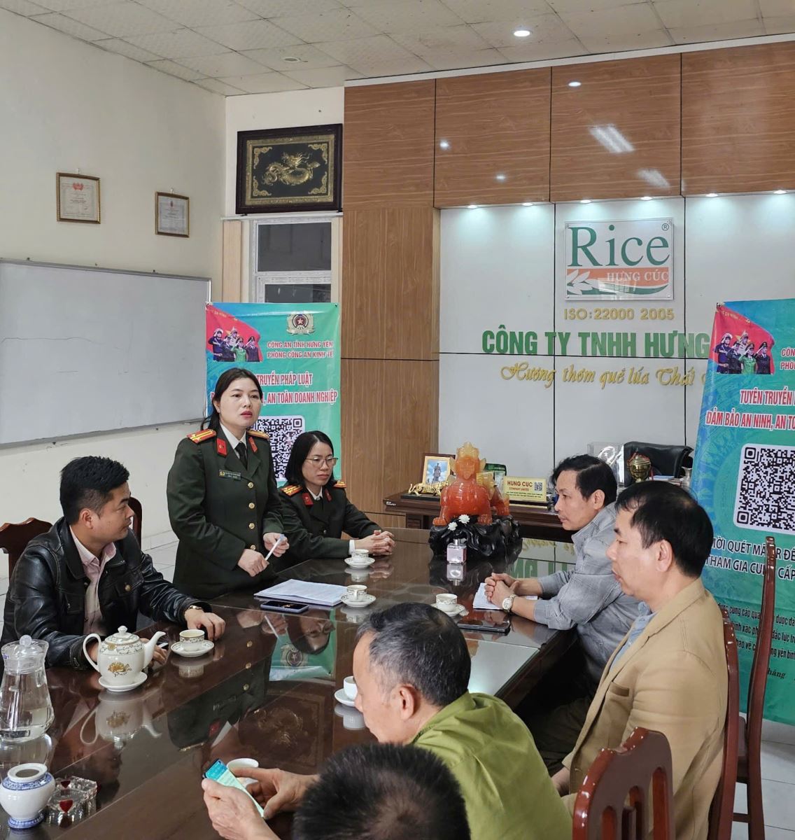 Nhằm cụ thể hóa các nhiệm vụ trong Kế hoạch của Giám đốc Công an tỉnh; Phòng An ninh kinh tế đã tổ chức các buổi hướng dẫn xây dựng mô hình tổ tự quản về ANTT và tuyên truyền pháp luật về an ninh, an toàn doanh nghiệp tại Công ty TNHH Liên Hạnh (địa chỉ: Cụm công nghiệp Vũ Thư, xã Vũ Thư) và Công ty TNHH Hưng Cúc (địa chỉ: Cụm công nghiệp Vũ Quang, xã Nam Đông Hưng). Qua buổi tuyên truyền cán bộ Phòng An ninh kinh tế đã phổ biến các nội dung về công tác bảo đảm an ninh, an toàn, giữ gìn trật tự trong cơ quan, doanh nghiệp, trọng tâm là tuyên truyền, phổ biến các quy định của pháp luật về bảo đảm an ninh, trật tự; Luật An ninh quốc gia, Luật An ninh mạng, các quy định về phòng, chống tội phạm, phòng, chống cháy nổ, bảo vệ bí mật nhà nước, bảo đảm an ninh nội bộ; trách nhiệm của người đứng đầu cơ quan, doanh nghiệp trong công tác xây dựng cơ quan, doanh nghiệp đạt tiêu chuẩn An toàn về an ninh, trật tự…