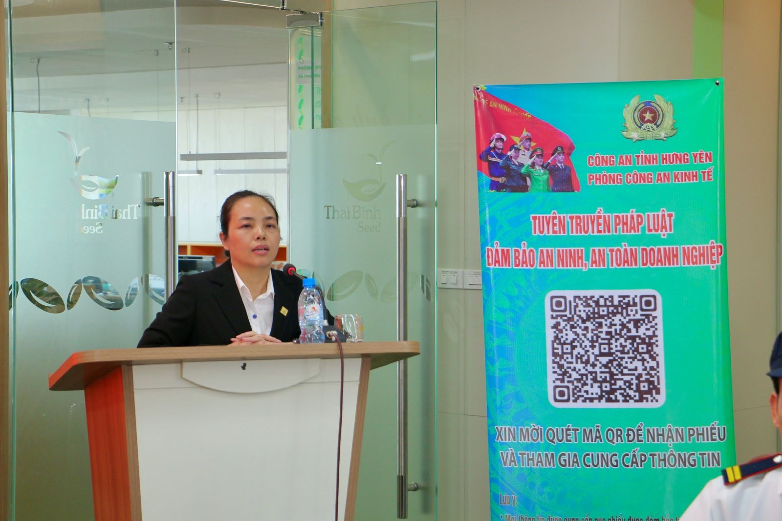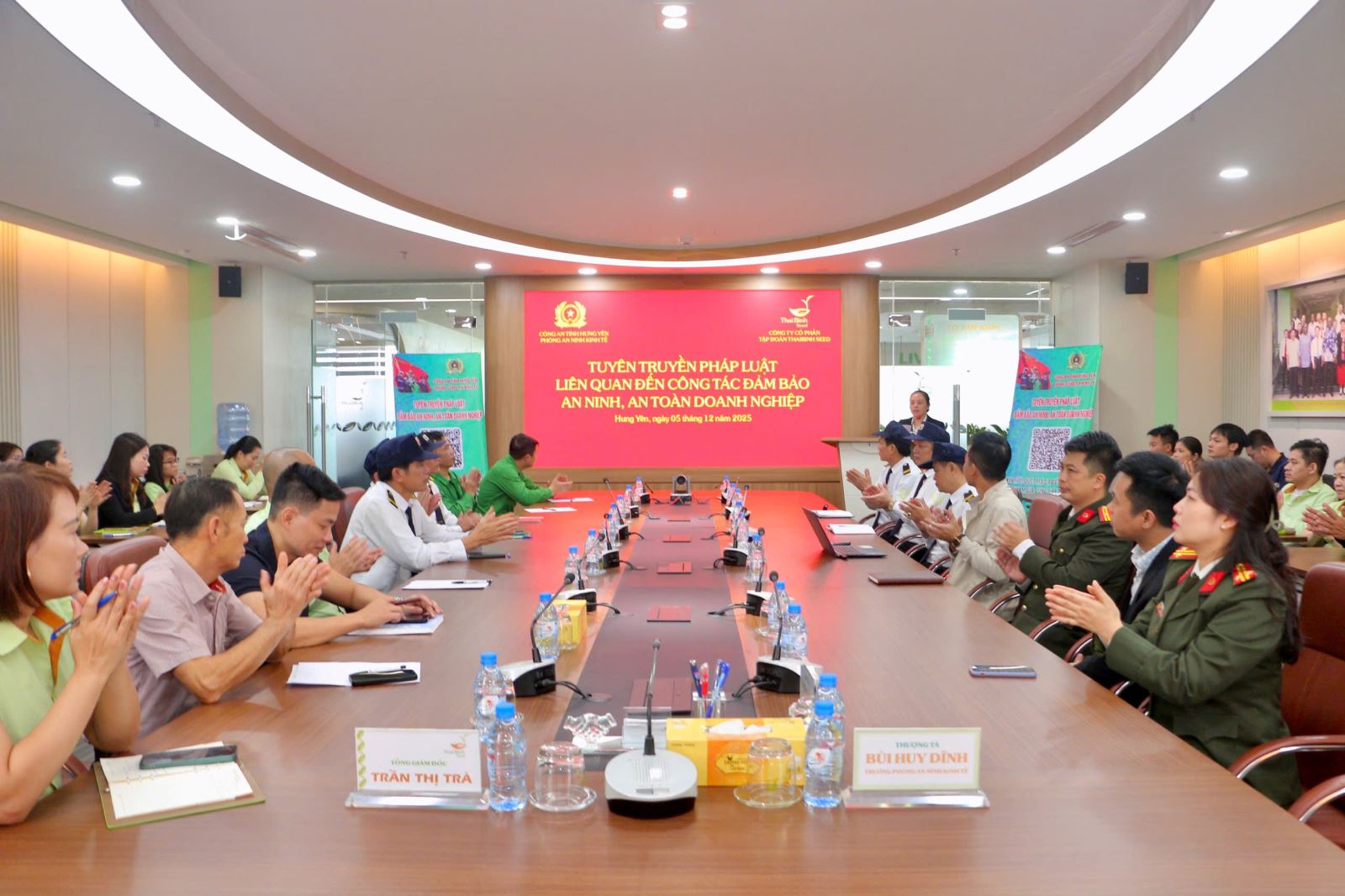 Ngày 05/12/2025, Phòng An ninh kinh tế – Công an tỉnh Hưng Yên đã phối hợp với Công ty CP Tập đoàn ThaiBinh Seed tổ chức buổi tuyên truyền, phổ biến pháp luật liên quan đến công tác đảm bảo an ninh, an toàn doanh nghiệp, đây là doanh nghiệp được Giám đốc Công an tỉnh công nhận mô hình tiêu biểu và thông báo nhân rộng trong phong trào toàn dân bảo vệ ANTQ năm 2025. Chương trình thu hút trên 50 cán bộ chủ chốt, tổ trưởng các bộ phận và Tổ tự quản ANTT của công ty tham dự.