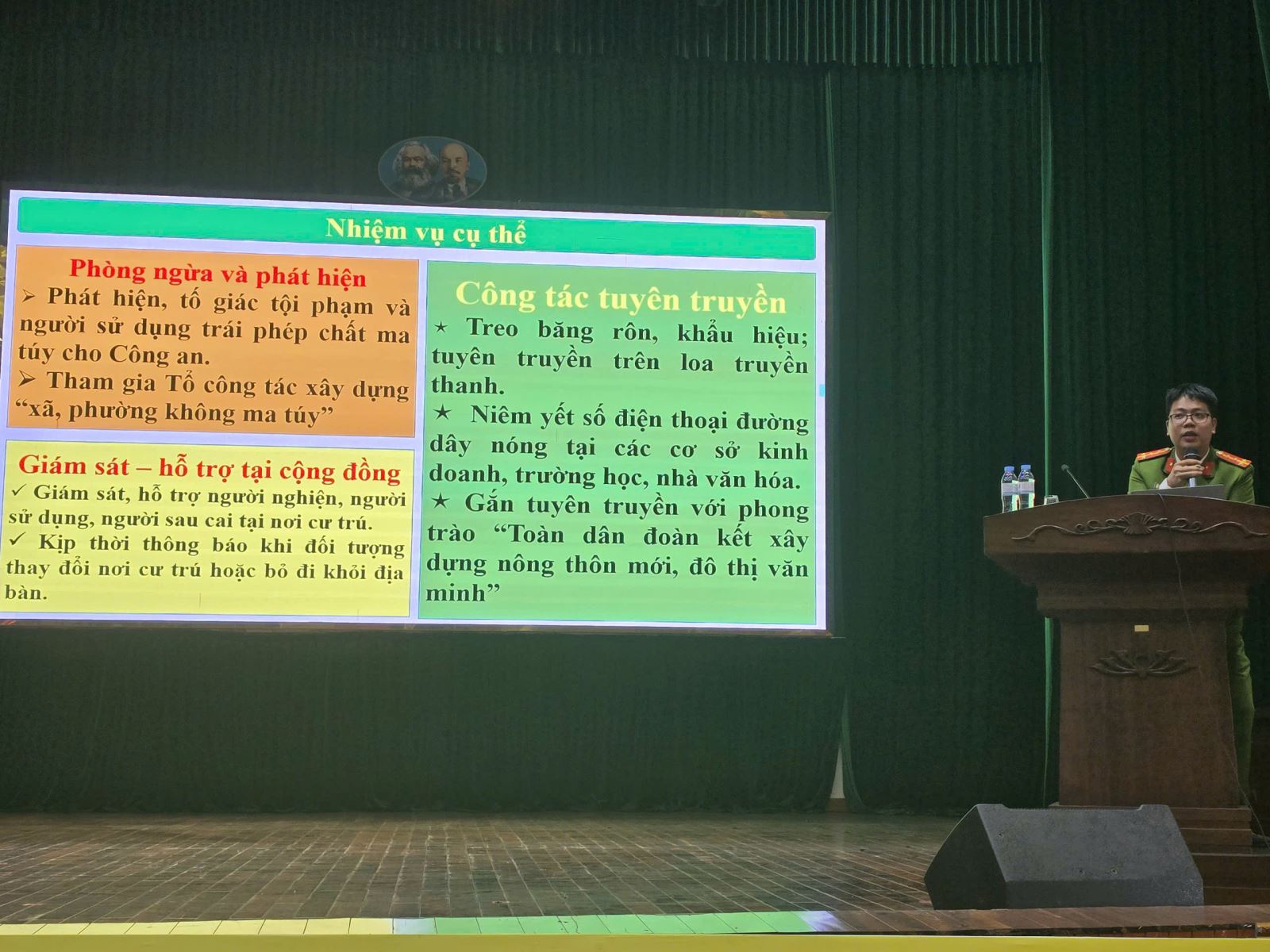 Tại các buổi tuyên truyền, Phòng Cảnh sát điều tra tội phạm về ma tuý đã phổ biến các quy định Luật Phòng, chống ma túy năm 2021, các văn bản hướng dẫn thi hành; cung cấp thông tin về tác hại của ma túy, thuốc lá điện tử, cũng như phương thức, thủ đoạn mới của tội phạm ma túy. Đồng thời, phổ biến, quán triệt các nội dung trong nhiệm vụ xây dưng dựng xã, phường không ma tuý trên địa bàn; trách nhiệm trong tuyên truyền, vận động nhân dân, hội viên phòng chống ma tuý; hỗ trợ công tác cai nghiện, tham gia cảm hoá, giáo dục, dạy nghề và hỗ trợ người cai nghiện ma tuý tái hoà nhập cộng đồng…