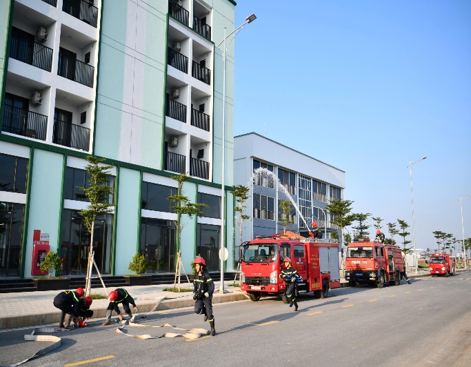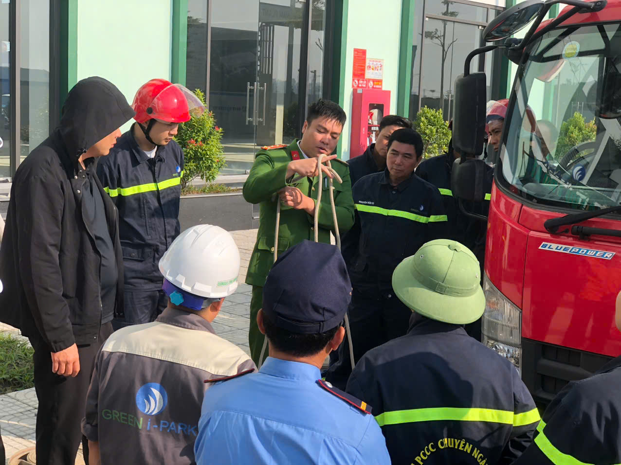 Tiếp đó, với tình huống giả định cháy tại Nhà lưu trú và kinh doanh dịch vụ Khu công nghiệp Liên Hà Thái (Green iP-1) thuộc Công ty Cổ phần Green i-Park. Lực lượng PCCC&CNCH cơ sở sử dụng phương tiện chữa cháy tại chỗ: bình chữa cháy xách tay, họng nước chữa cháy vách tường, 02 xe chữa cháy để triển khai công tác chữa cháy ban đầu. Lực lượng Cảnh sát PCCC&CNCH huy động 13 cán bộ chiến sỹ, 02 xe chữa cháy cùng các phương tiện chữa cháy, CNCH chuyên dùng theo xe triển khai tìm kiếm người bị nạn, phun nước làm mát, ngăn cháy lan ra khu vực xung quanh và dập tắt đám cháy.
