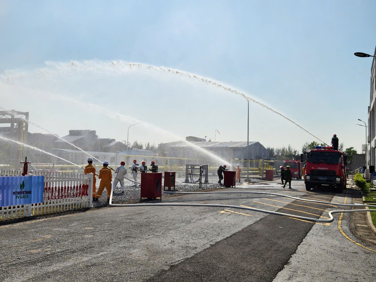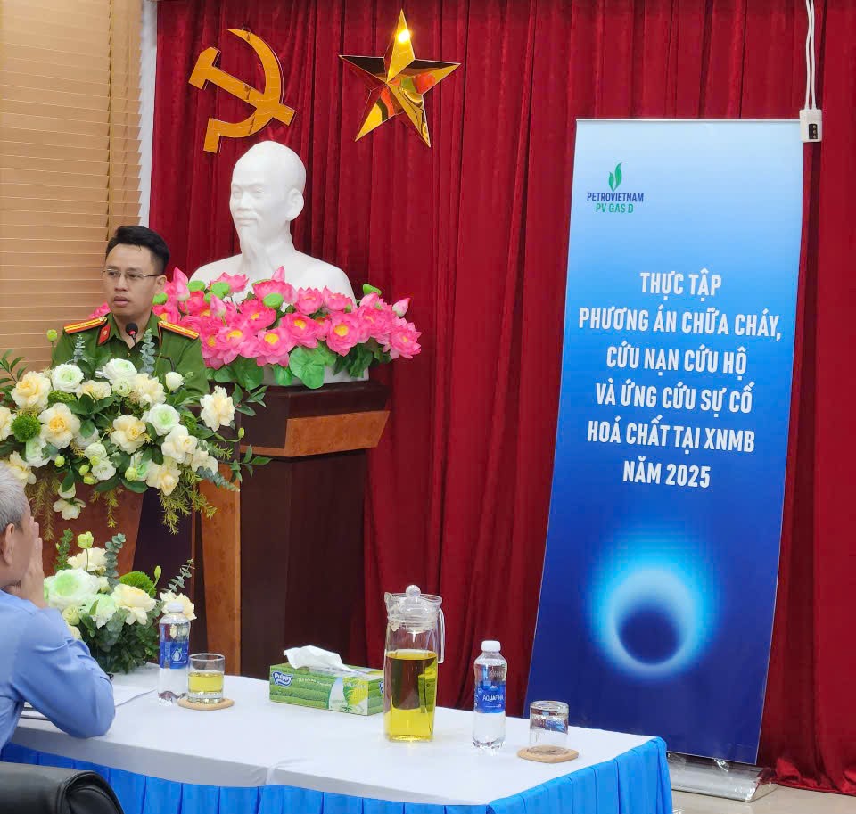 Tiếp đó, với tình huống giả định nhân viên bảo dưỡng sửa chữa thực hiện bảo dưỡng tại Filter (F-2201A), trong quá trình thực hiện công việc, lõi lọc filter gặp không khí bốc cháy, kết hợp rò rỉ khí tại Ball valve BA-2206 gây bùng phát đám cháy khiến 01 nhân viên bị bỏng, bất tỉnh. Chất cháy chủ yếu là khí thiên nhiên (CH4), với áp suất khí trong đường ống thấp, nếu không được kiểm soát, đám cháy có nguy cơ cháy lan ra các Trạm Khách hàng Khí thấp áp. Trong điều kiện này, cần có sự hỗ trợ của lực lượng Cảnh sát PCCC&CNCH. Xí nghiệp đã tổ chức sơ tán công nhân, lực lượng, phương tiện chữa cháy cơ sở được triển khai chữa cháy, CNCH ban đầu. Sau khi nhận được tin báo, Phòng Cảnh sát PCCC và CNCH đã điều cán bộ, chiến sĩ Đội Cảnh sát CC và CNCH khu vực Tiền Hải cùng 3 xe chuyên dụng đến hiện trường, phối hợp với lực lượng, phương tiện chữa cháy của cơ sở triển khai đội hình trinh sát, tìm kiếm, cứu người bị nạn, ngăn chặn cháy lan, dập tắt đám cháy và ứng cứu sự cố hóa chất. Sau khi đám cháy đã được dập tắt, chỉ huy chữa cháy bàn giao hiện trường cho lực lượng Công an xã, lực lượng cơ sở để bảo vệ và tiến hành điều tra nguyên nhân vụ cháy theo quy định. Phương án giả định tình huống cháy bám sát với thực tế, các lực lượng tổ chức thực tập đúng với tình huống đề ra trong phương án và trang thiết bị chữa cháy tại chỗ.