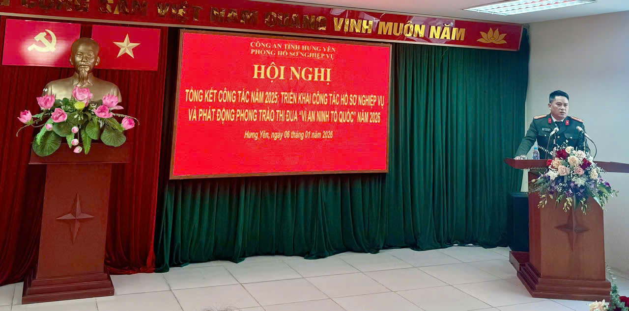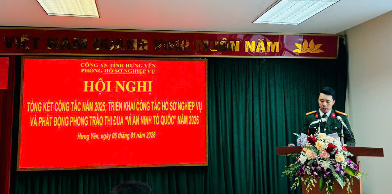 Ngày 06/01/2026, Phòng Hồ sơ nghiệp vụ Công an tỉnh tổ chức Hội nghị tổng kết công tác năm 2025, triển khai công tác hồ sơ nghiệp vụ và phát động phong trào thi đua “Vì an ninh Tổ quốc” năm 2026. Dự Hội nghị có đại diện các phòng chức năng thuộc Công an tỉnh; tập thể cấp ủy, lãnh đạo, chỉ huy, cán bộ, chiến sĩ thuộc phòng Hồ sơ nghiệp vụ.