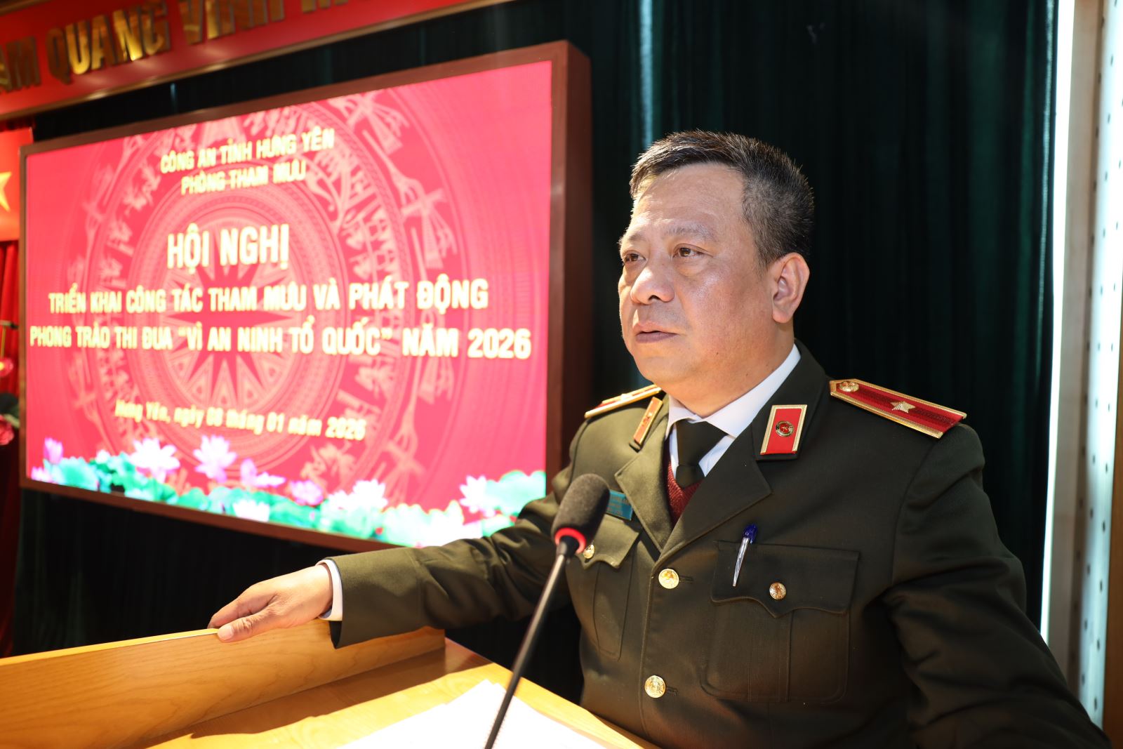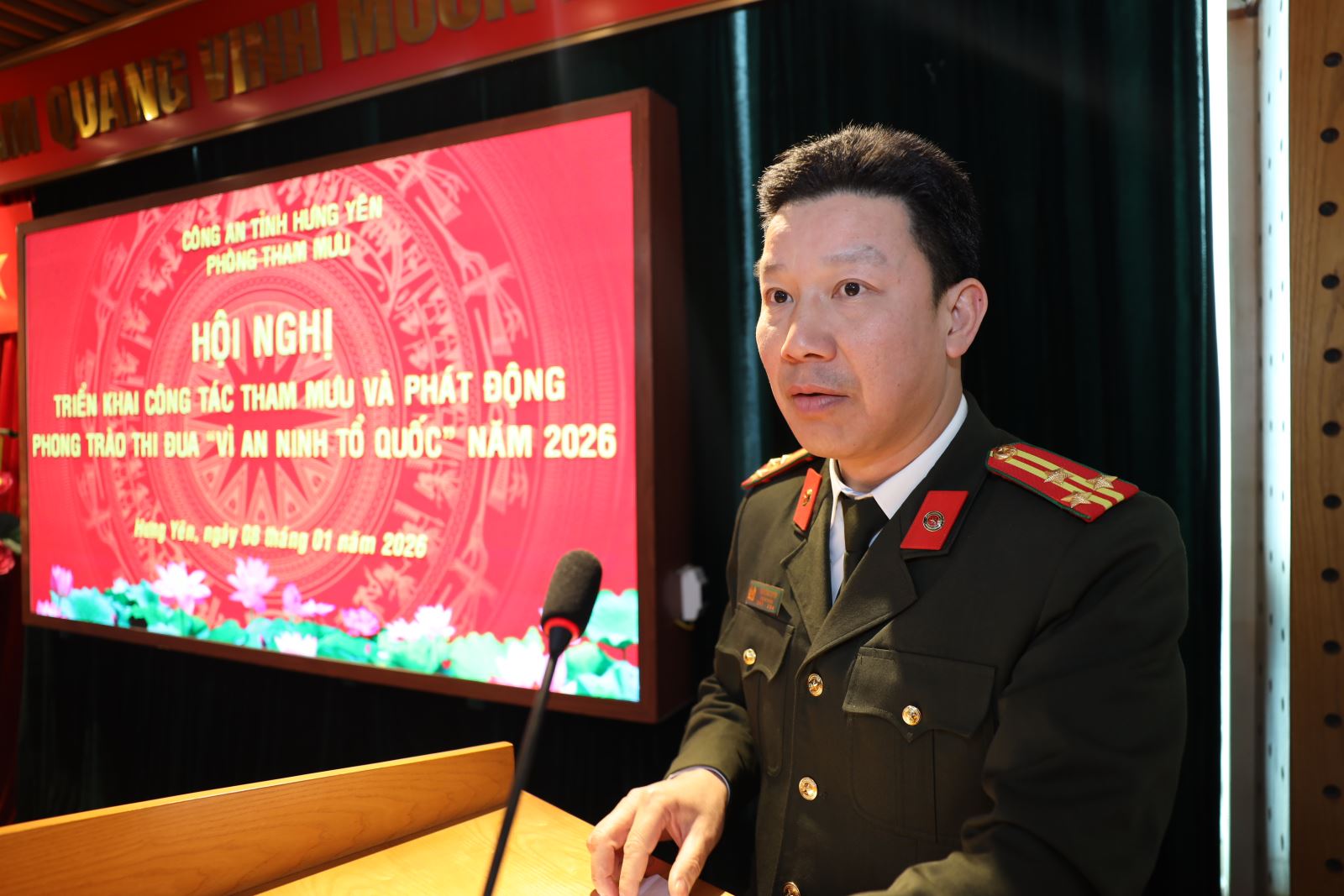 Sáng ngày 08/01/2026, Phòng Tham mưu Công an tỉnh tổ chức Hội nghị triển khai công tác tham mưu và phát động phong trào thi đua “Vì an ninh Tổ quốc” năm 2026. Dự và chỉ đạo Hội nghị có đồng chí Thiếu tướng Trần Xuân Ánh - Ủy viên Ban Thường vụ Tỉnh ủy, Bí thư Đảng ủy, Giám đốc Công an tỉnh. Cùng dự có Lãnh đạo các phòng chức năng Công an tỉnh; tập thể Lãnh đạo, chỉ huy và cán bộ chiến sĩ Phòng Tham mưu.