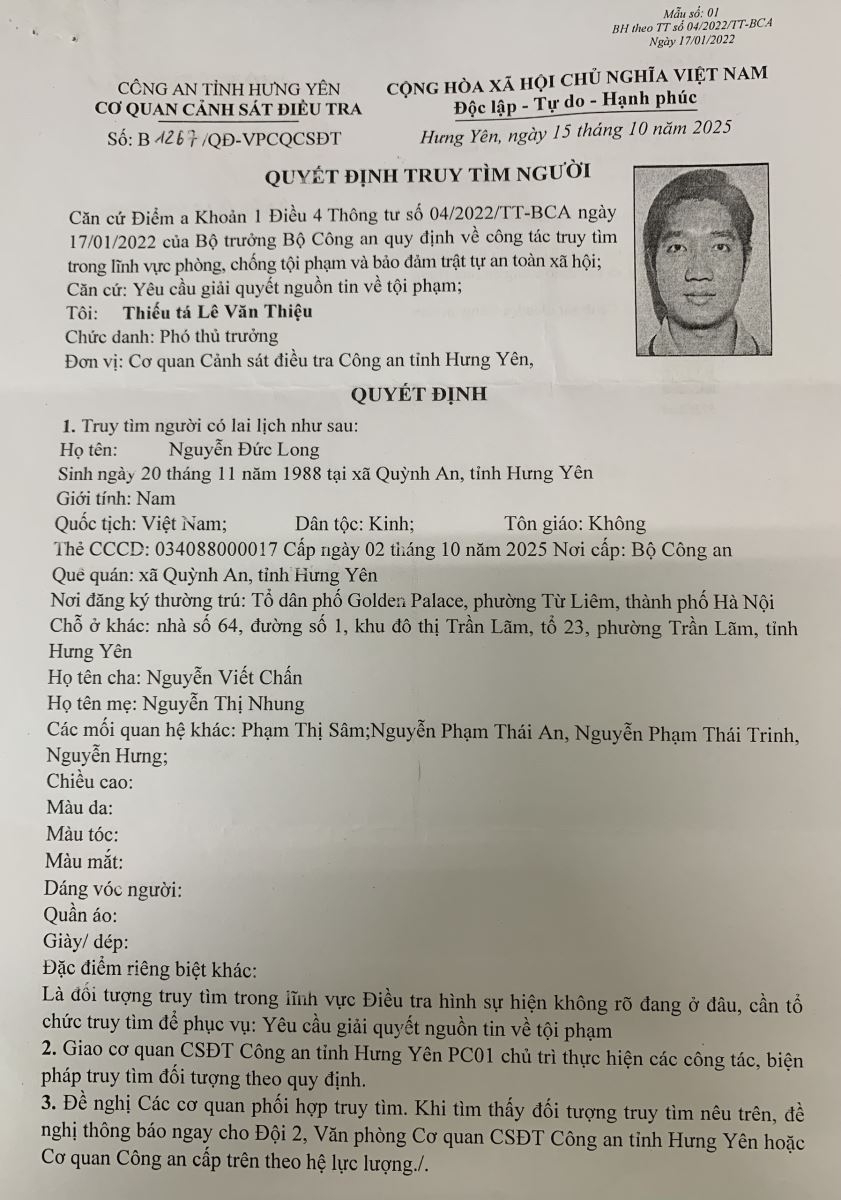 Quyết định truy tìm Nguyễn Đức Long, sinh năm 1988, trú tại phường Từ Liêm, thành phố Hà Nội