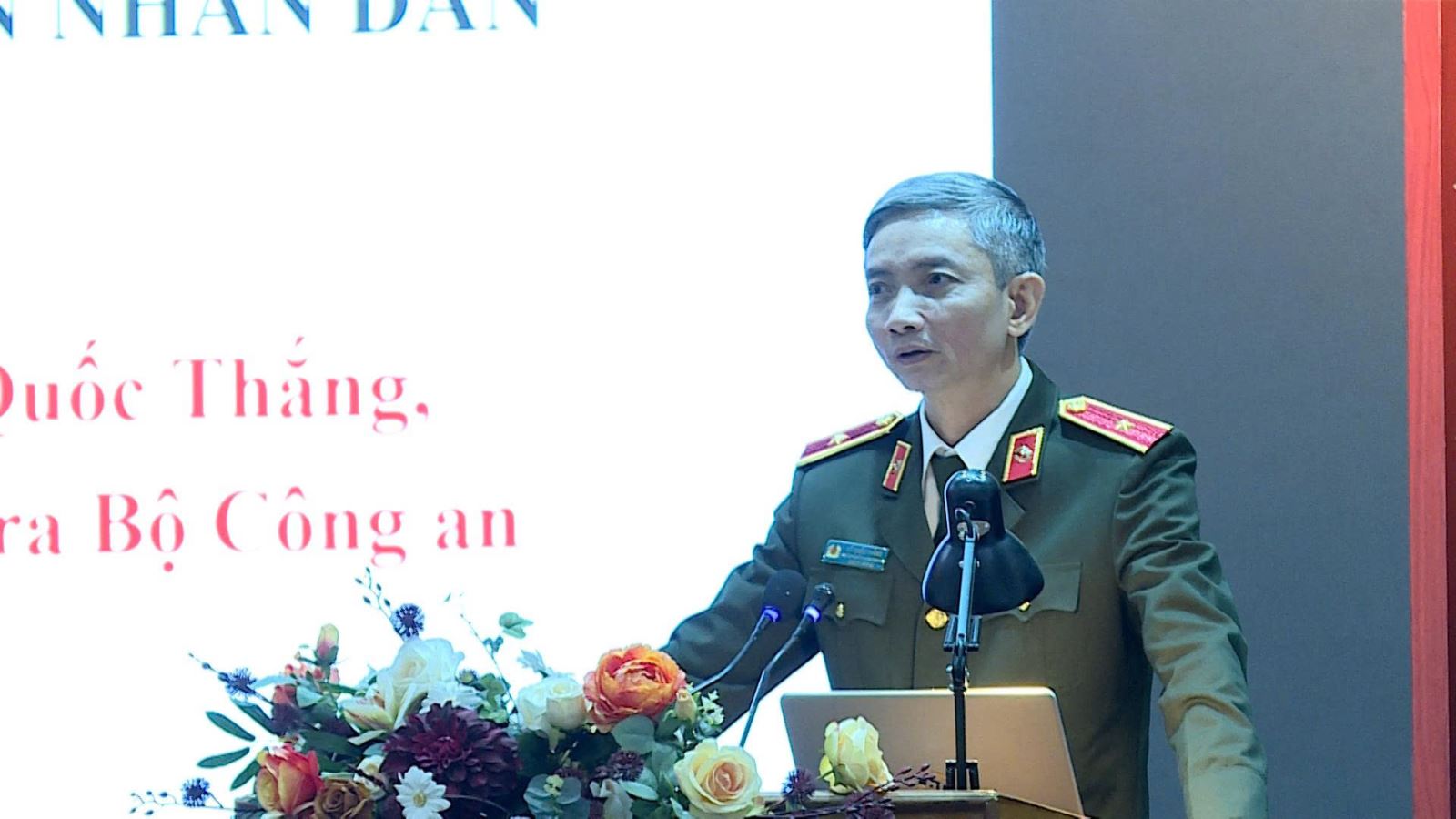 Đồng chí Thiếu tướng Vũ Quốc Thắng - Phó Chánh Thanh tra Bộ Công an truyền đạt nội dung tập huấn tại hội nghị