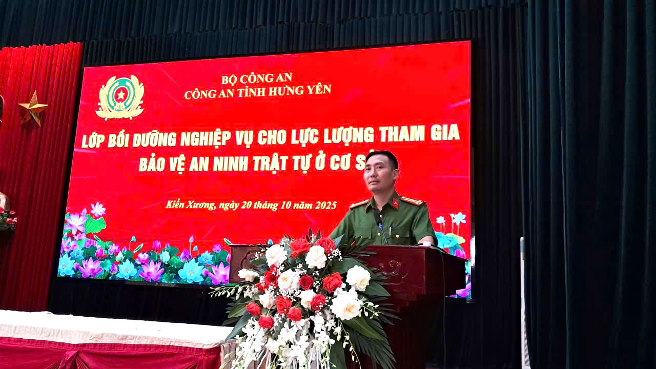 Sáng ngày 21/10/2025, Công an tỉnh Hưng Yên tổ chức lớp tập huấn, bồi dưỡng công tác nghiệp vụ cho lực lượng tham gia bảo vệ an ninh trật tự ở cơ sở đối với công tác quản lý hành chính về trật tự xã hội, công tác tuần tra bảo đảm an ninh, trật tự, trật tự an toàn giao thông và thực hiện nhiệm vụ bảo vệ an ninh trật tự khi được điều động; tham gia lớp tập huấn gồm tổ trưởng, tổ phó các tổ bảo vệ ANTT tại xã Kiến Xương.