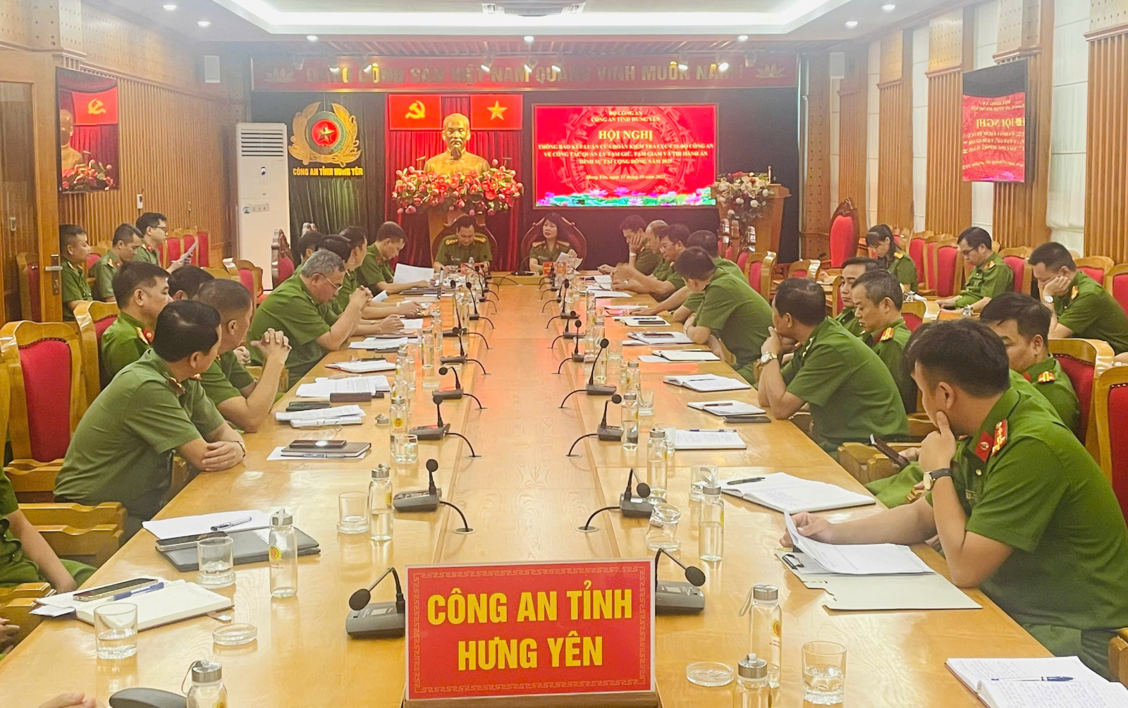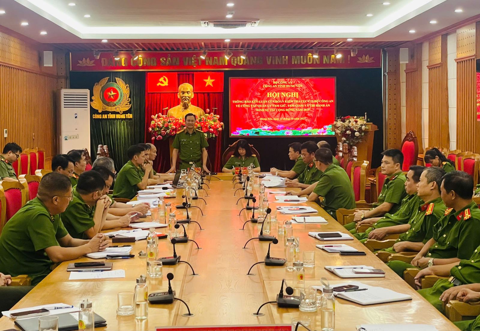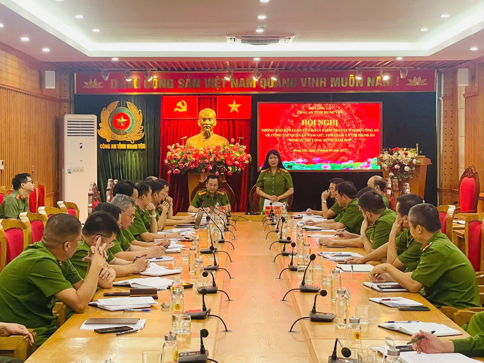 Chiều ngày 15/10/2025, Đoàn công tác do đồng chí Đại tá Nguyễn Thị Quế Thu, Phó Cục trưởng Cục Cảnh sát quản lý tạm giữ, tạm giam và thi hành án hình sự tại cộng đồng, Bộ Công an - Trưởng đoàn đã thông báo kết luận kiểm tra về công tác tạm giữ, tạm giam, thi hành án hình sự tại cộng đồng năm 2025 đối với Công an tỉnh Hưng Yên. Dự Hội nghị có đồng chí Đại tá Phạm Thanh Tiến, Phó Giám đốc, Thủ trưởng Cơ quan Quản lý tạm giữ, tạm giam, thi hành án hình sự Công an tỉnh.