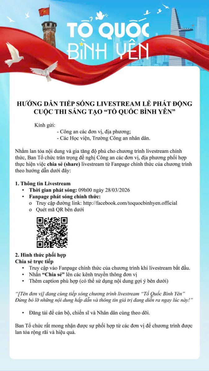 Nhằm lan tỏa chân thực, sinh động những câu chuyện nhân văn, hành động cao đẹp, sự hy sinh, cống hiến thầm lặng của cán bộ, chiến sĩ Công an nhân dân; sự phối hợp, hiệp đồng của Nhân dân trong công cuộc bảo vệ an ninh quốc gia, giữ gìn trật tự, an toàn xã hội; góp phần xây dựng vững chắc thế trận an ninh nhân dân trong kỷ nguyên số, thiết thực chào mừng kỷ niệm 80 năm Ngày truyền thống lực lượng An ninh nhân dân (12/7/1946 – 12/7/2026). Cổng thông tin điện tử Công an tỉnh thông báo đến toàn thể cán bộ chiến sĩ và Nhân dân Lễ phát động cuộc thi sáng tạo Video clip “Tổ quốc bình yên” do Bộ Công an phối hợp Bộ Giáo dục và đào tạo tổ chức.