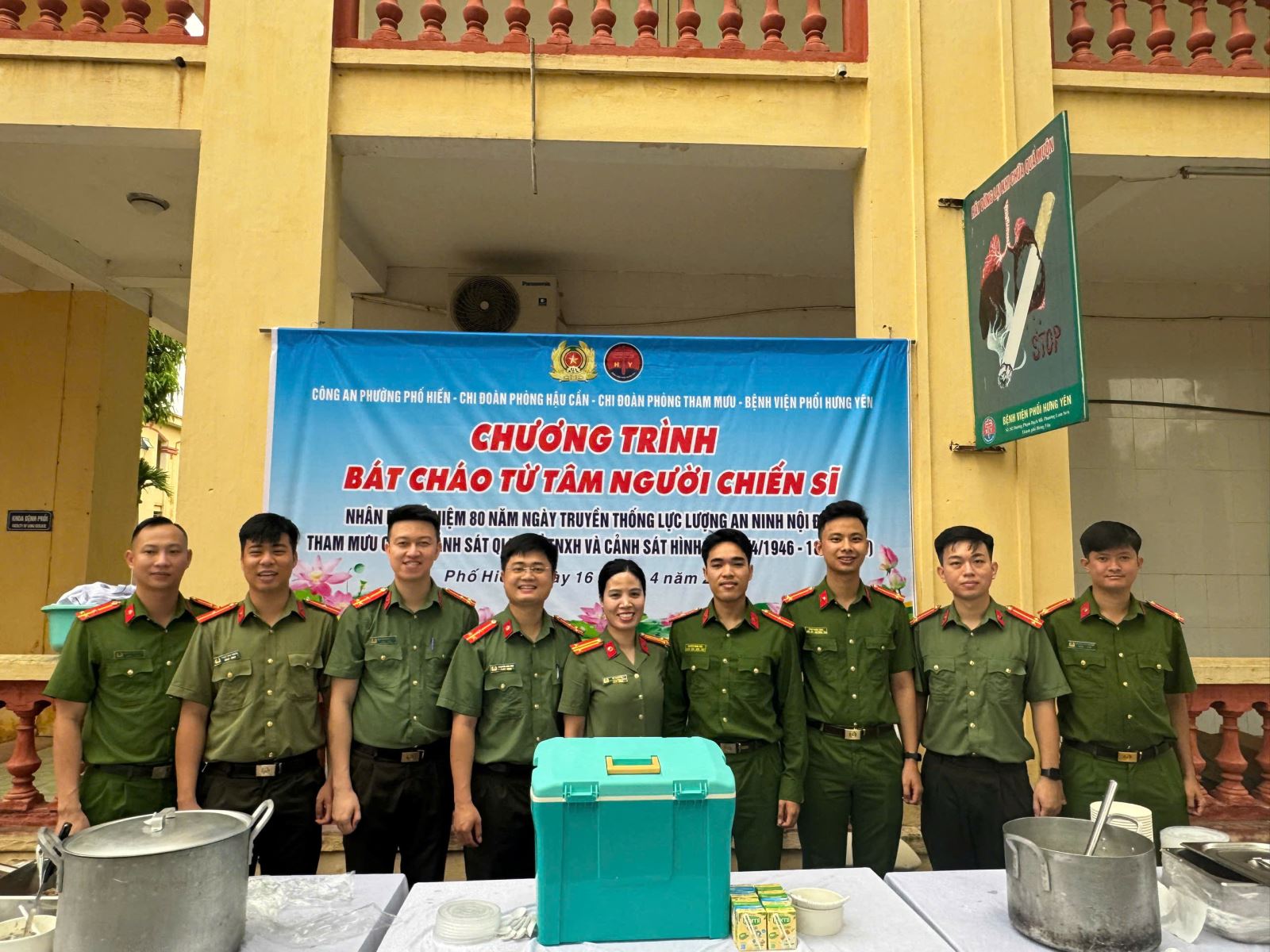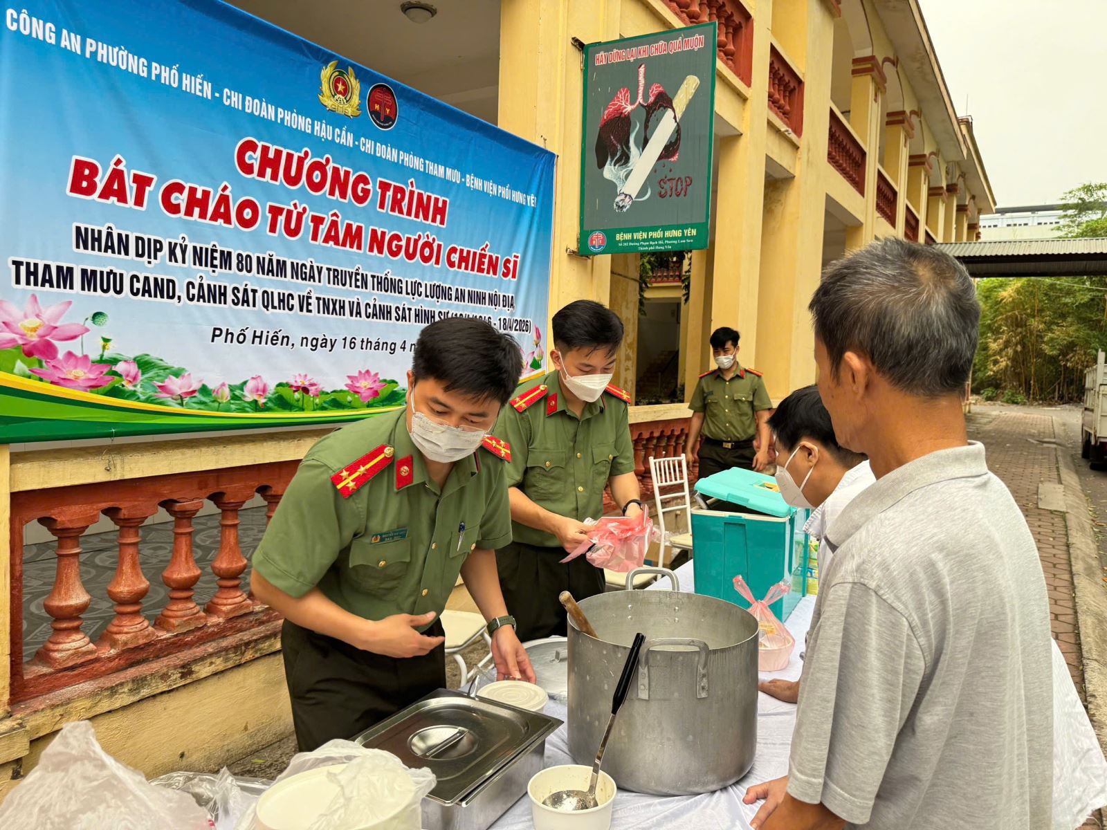Cụ thể, sáng ngày 16/4/2026, Chi đoàn Phòng Tham mưu đã phối hợp Công an phường Phố Hiến, Chi đoàn Phòng Hậu cần và Bệnh viện phổi Hưng Yên tổ chức chương trình “Bát cháo từ tâm người chiến sĩ”. Ngay từ sáng sớm, những suất cháo nóng hổi và những phần quà đã được cán bộ, chiến sĩ của các đơn vị chuẩn bị chu đáo. Hoạt động diễn ra trong không khí vui tươi, phấn khởi và tràn đầy ấm áp từ tình cảm của cán bộ, chiến sĩ đối với những bệnh nhân đang điều trị tại Bệnh viện phổi Hưng Yên. Với sự tham gia tích cực, trách nhiệm hơn 300 suất cháo và các phần quà đã được trao tận tay những bệnh nhân đang điều trị tại bệnh viện. Những phần quà tuy không lớn về vật chất nhưng cũng là lời động viên, an ủi tinh thần và san sẻ những khó khăn đối với các bệnh nhân, giúp họ cảm nhận được sự quan tâm, chia sẻ từ cộng đồng. Qua hoạt động thiện nguyện đã góp phần bồi dưỡng thêm phẩm chất đạo đức, lối sống, tư tưởng “Vì dân, gần dân, sát dân” cho cán bộ, chiến sĩ các đơn vị và xây dựng hình ảnh người chiến sĩ Công an nhân dân gần gũi, nhân văn, vì Nhân dân phục vụ.