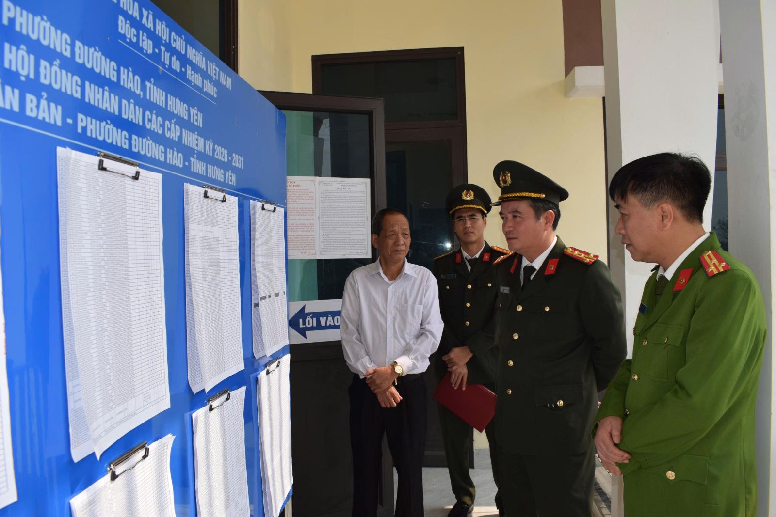 Đồng chí Đại tá Nguyễn Thành Sơn, Phó Bí thư Đảng ủy, Phó Giám đốc Công an tỉnh kiểm tra công tác đảm bảo an ninh trật tự tại một số điểm bầu cử địa bàn phường Mỹ Hào, Đường Hào và xã Xuân Trúc