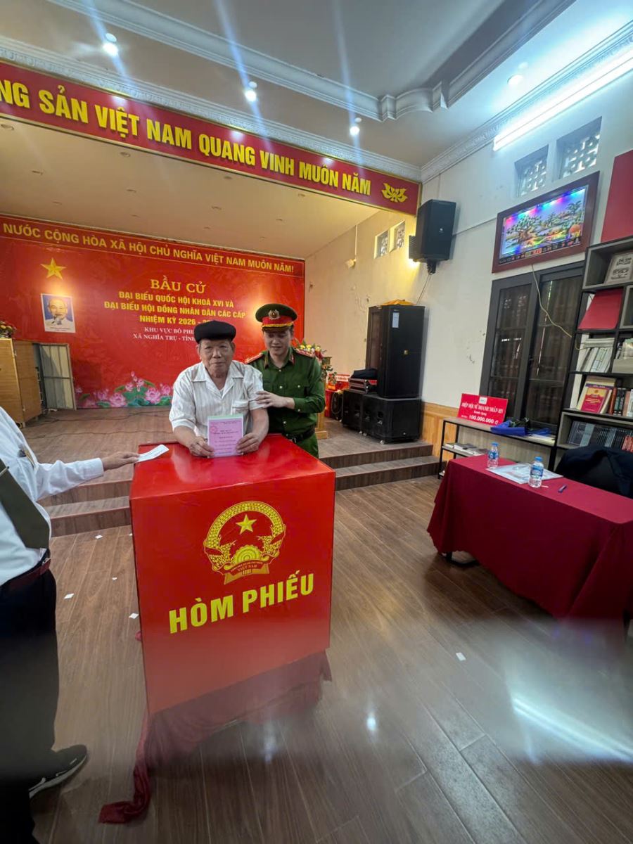 Công an xã Tiên Hoa hỗ trợ cử tri khuyết tật đi bỏ phiếu, đảm bảo an ninh, an toàn cho cuộc bầu cử