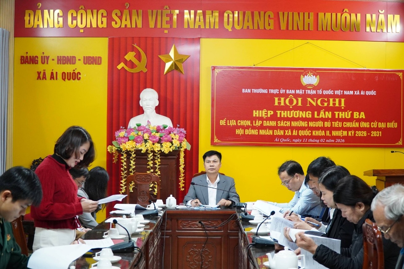Sáng ngày 11/2/2026, Thường trực Uỷ ban MTTQ xã Ái Quốc tổ chức hội nghị hiệp thương lần thứ ba để thảo luận, chốt danh sách những người đủ tiêu chuẩn ứng cử đại biểu Hội đồng nhân dân xã nhiệm kỳ 2026 – 2031
