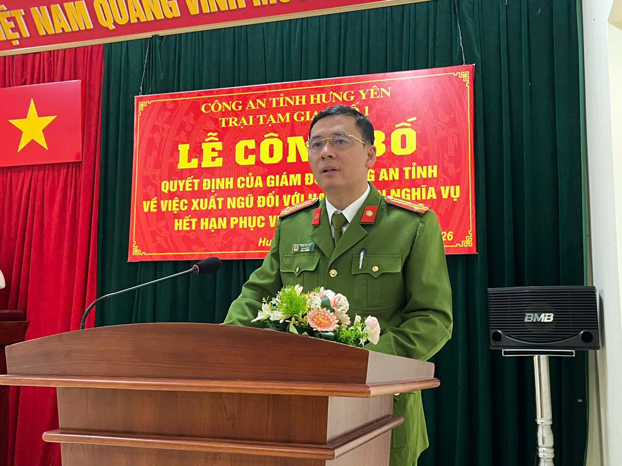 Ngày 26/02/2026, Trại tạm giam số 1 Công an tỉnh Hưng Yên tổ chức Lễ công bố quyết định xuất ngũ đối với 34 công dân thực hiện nghĩa vụ tham gia Công an nhân dân đợt tháng 02/2024. Dự và chỉ đạo buổi lễ có đồng chí Thượng tá Trần Thế Lực, Phó Giám thị Trại tạm giam số 1; cùng lãnh đạo đơn vị, ban chỉ huy các đội nghiệp vụ, Chủ tịch Hội phụ nữ, Bí thư Đoàn thanh niên và 34 đồng chí là công dân thực hiện nghĩa vụ Công an nhân dân khóa 2024 – 2026.