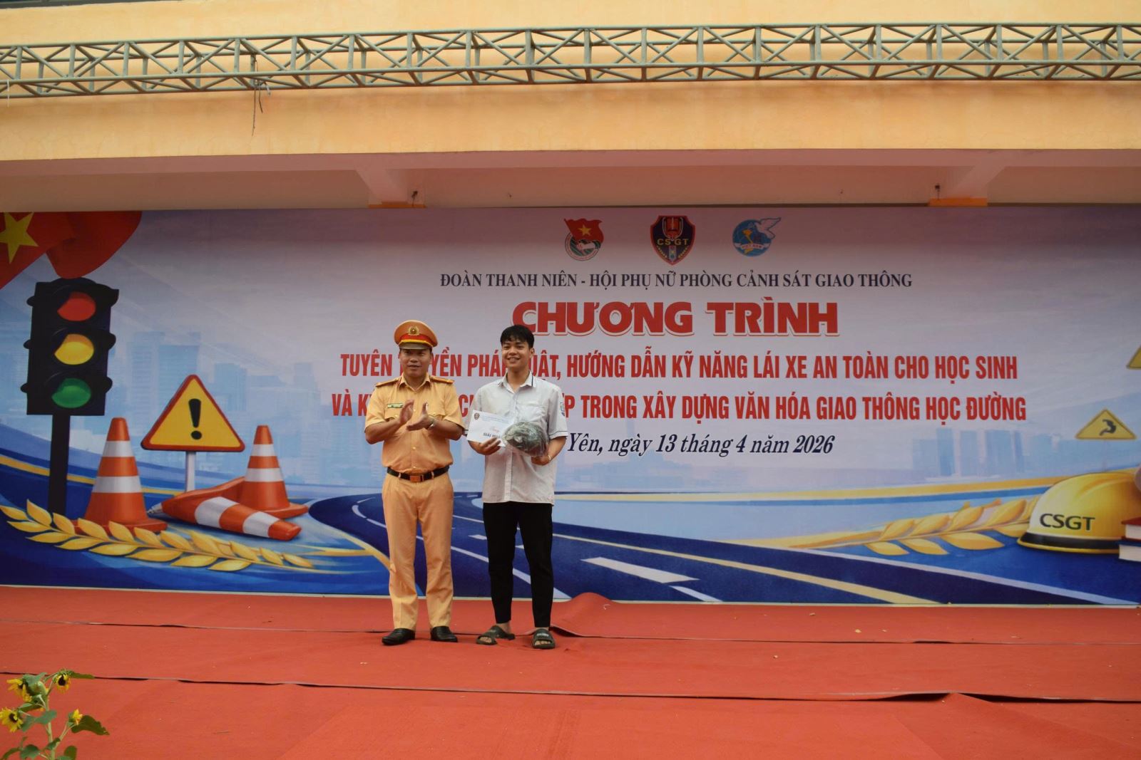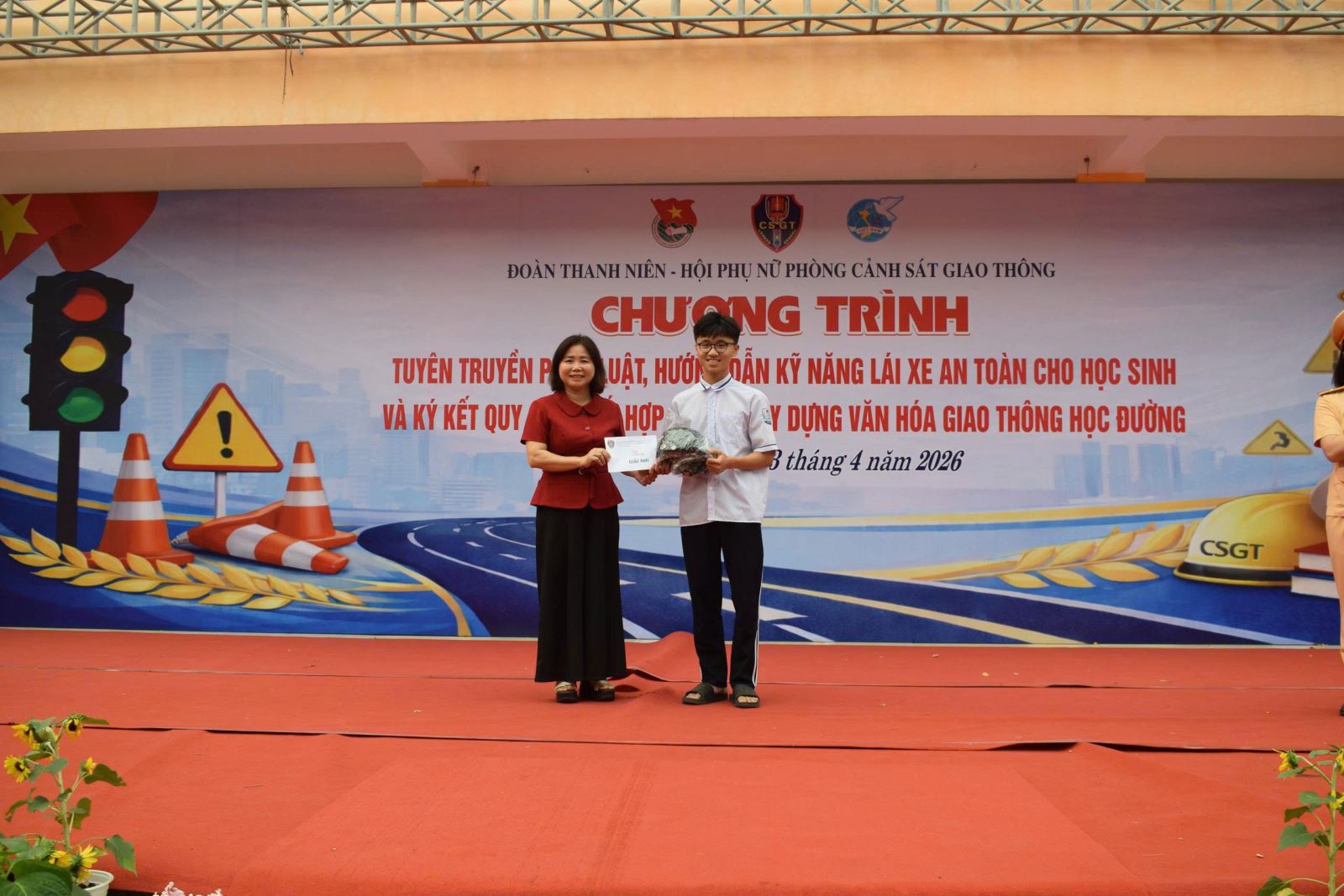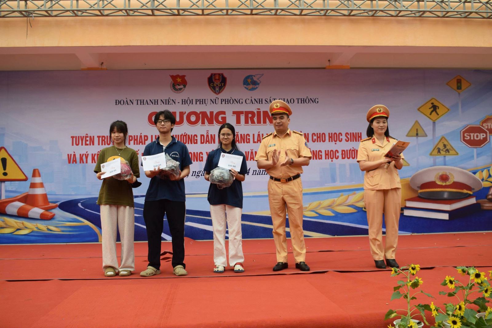 Đáng chú ý, nhằm tăng tính tương tác và giúp học sinh củng cố kiến thức một cách sinh động, Ban tổ chức đã tổ chức phần thi tìm hiểu kiến thức về trật tự, an toàn giao thông qua mã quét QR code. Các em học sinh tham gia trả lời 20 câu hỏi trong thời gian 10 phút với nội dung xoay quanh các quy định pháp luật về trật tự, an toàn giao thông và kỹ năng tham gia giao thông an toàn. Kết thúc phần thi, Ban Tổ chức đã trao 01 giải Nhất, 01 giải Nhì và 03 giải Ba cho các học sinh có kết quả xuất sắc, qua đó tạo không khí thi đua sôi nổi, góp phần lan tỏa tinh thần học tập và chấp hành pháp luật trong toàn trường.
