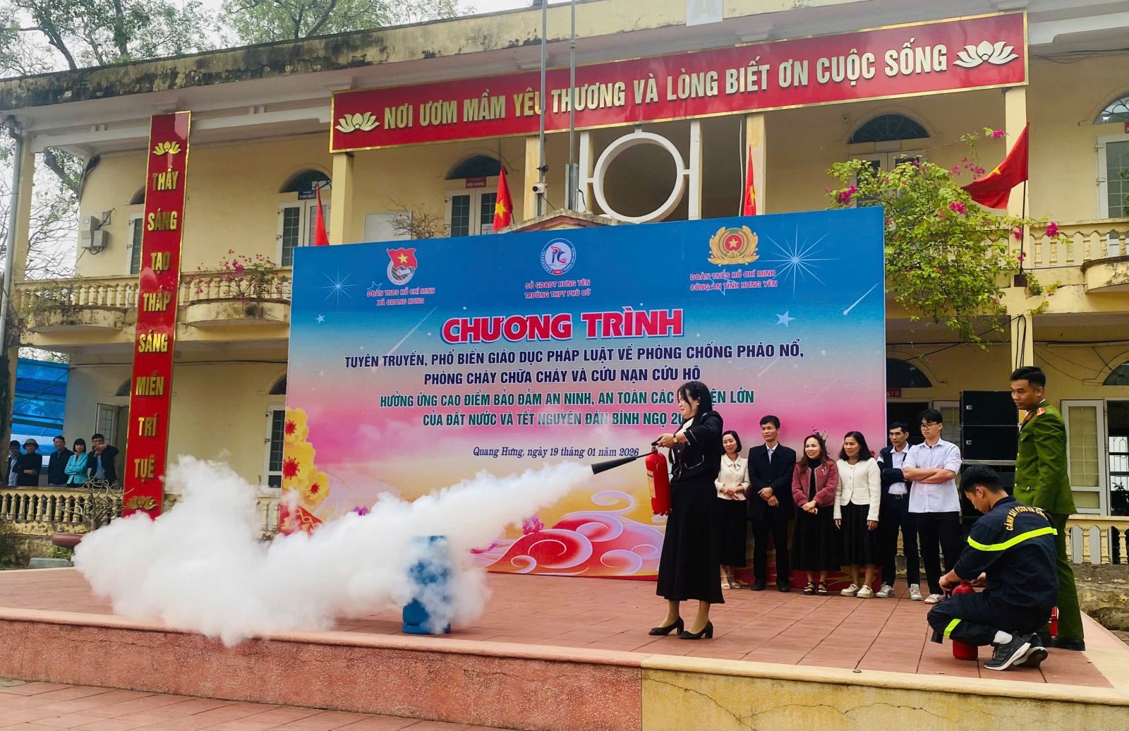 Hưởng ứng cao điểm bảo đảm an ninh, an toàn các sự kiện lớn của đất nước và Tết Nguyên đán Bính Ngọ 2026, sáng ngày 19/01/2026, Ban Thanh niên Công an tỉnh phối hợp với Đoàn Thanh niên xã Quang Hưng và Trường Trung học phổ thông Phù Cừ tổ chức Chương trình tuyên truyền, phổ biến, giáo dục pháp luật về phòng, chống pháo nổ; phòng cháy chữa cháy và cứu nạn cứu hộ.