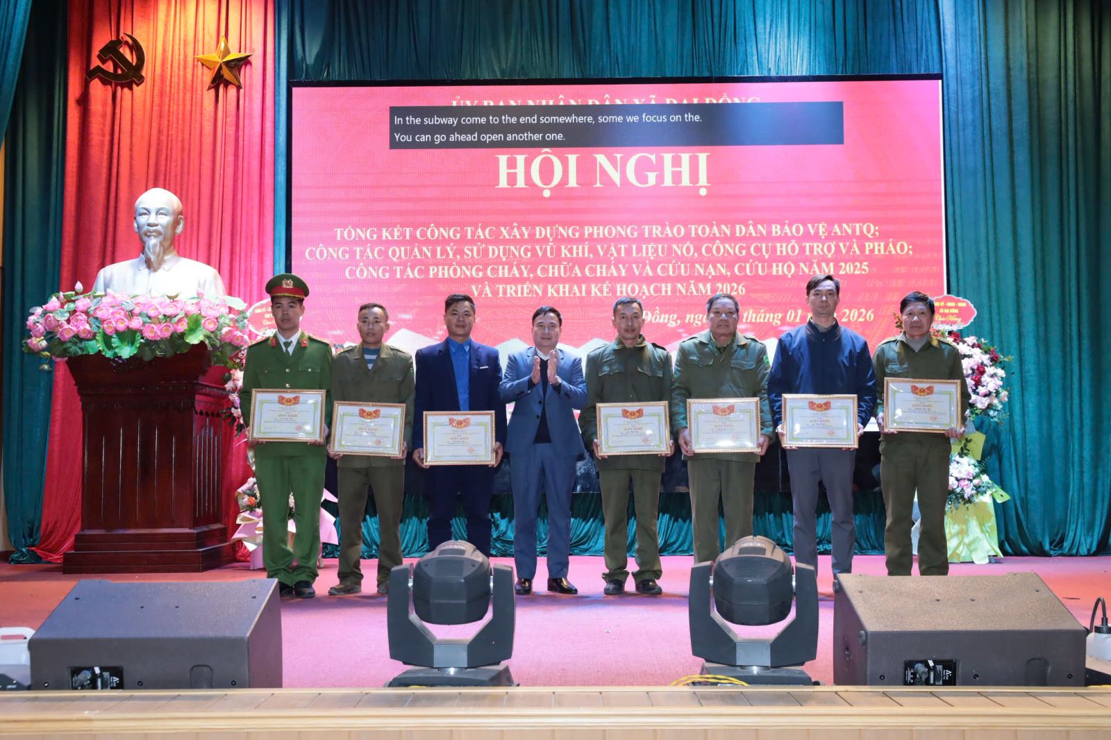 Tại hội nghị, đã trao 11 tập thể và 13 cá nhân được trao tặng Giấy khen của Chủ tịch UBND xã về thành tích xuất sắc trong phong trào toàn dân bảo vệ an ninh Tổ quốc; công tác PCCC & CHCN; công tác quản lý sử dụng VK,VLN,CCHT và pháo năm 2025.