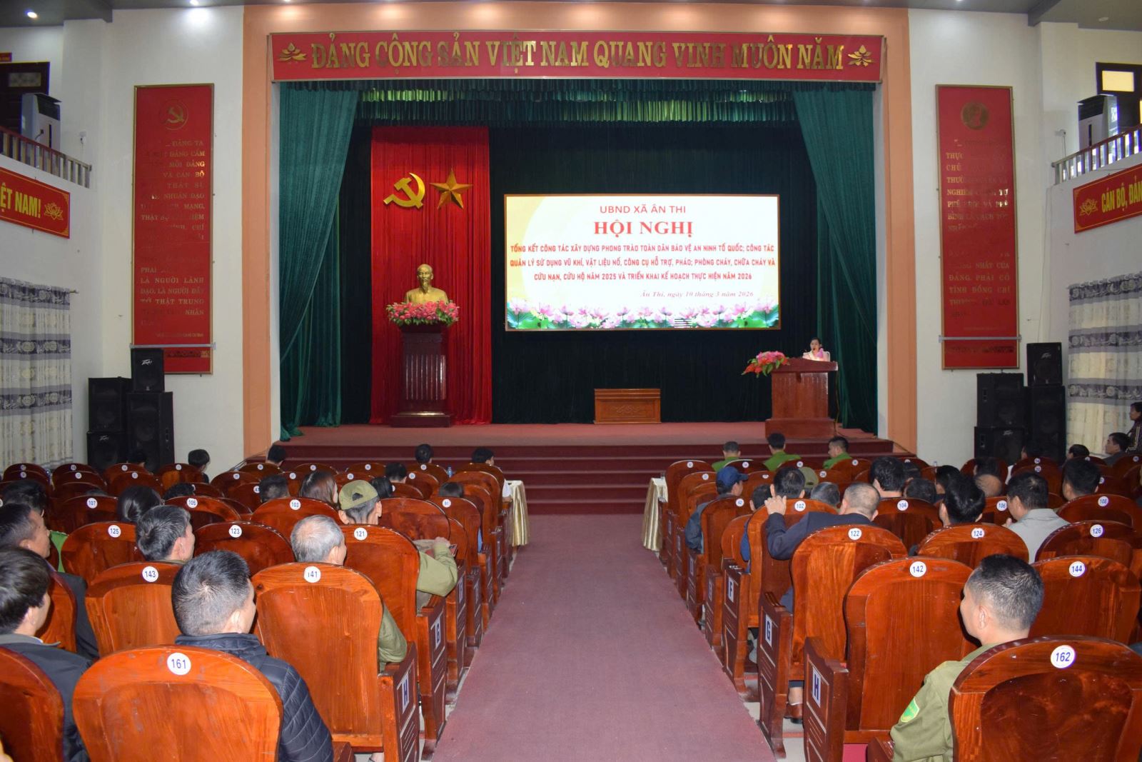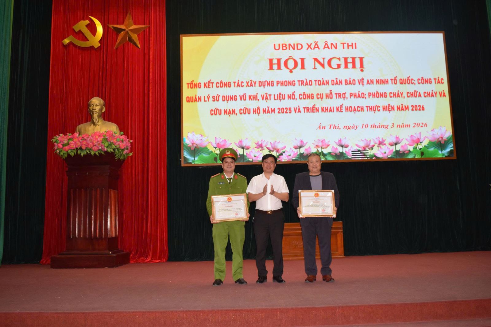 Ngày 10/3/2026, xã Ân Thi tổ chức hội nghị tổng kết phong trào “Toàn dân bảo vệ an ninh Tổ quốc; công tác quản lý, sử dụng vũ khí, vật liệu nổ, công cụ hỗ trợ và pháo; công tác phòng cháy chữa cháy (PCCC) và cứu hộ cứu nạn năm 2025, triển khai nhiệm vụ năm 2026.