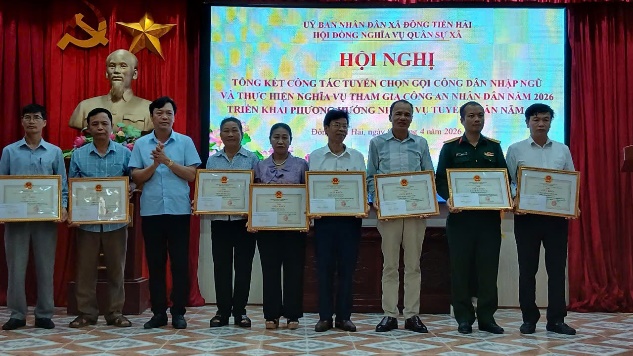 Để ghi nhận và biểu dương những tập thể, cá nhân trong công tác tuyển chọn công dân nhập ngũ năm 2026, UBND xã Đông Tiền Hải đã tặng giấy khen cho 08 tập thể, 12 cá nhân có thành tích tốt trong công tác tuyển chọn công dân nhập ngũ năm 2026.