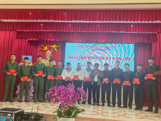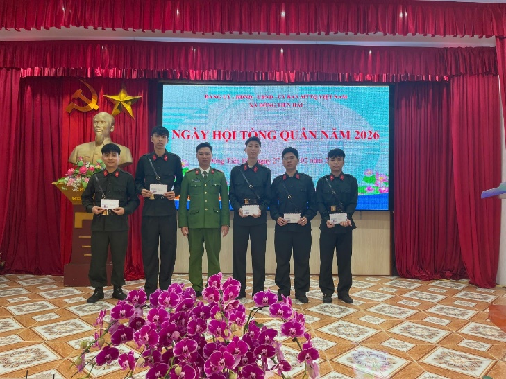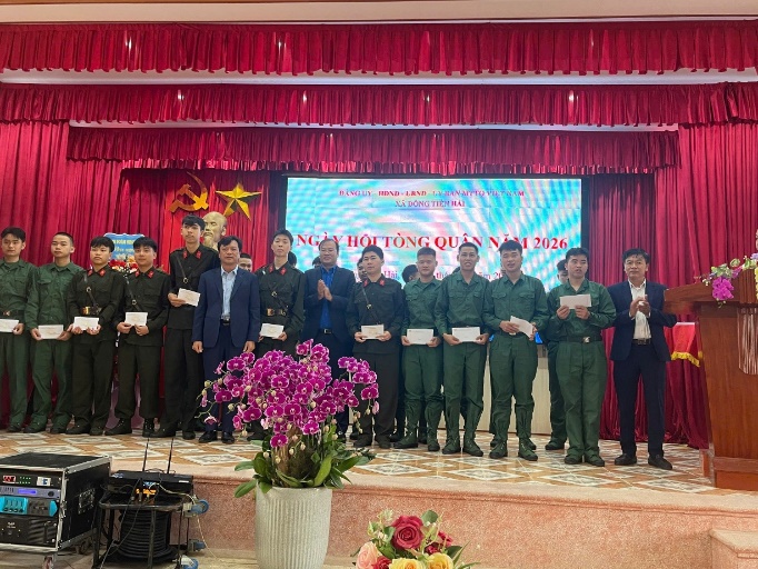 Tại buổi lễ đã công bố Quyết định gọi công dân nhập ngũ năm 2026 của Chủ tịch Ủy ban nhân dân xã Đông Tiền Hải đối với 59 đồng chí (Bộ đội 54 đồng chí; công an 05 đồng chí). Các đồng chí lãnh đạo địa phương tặng quà của UBND tỉnh, UBND xã, Ủy ban MTTQVN xã cho các công dân nhập ngũ năm 2026.